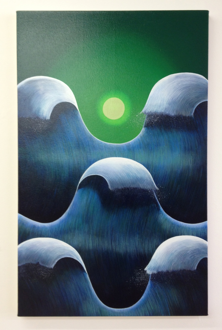 Matthew Fisher’s tidy waves look like carefully coiffured heads rising from the deeps and arranged in careful rows, like a school picture or choir rehearsal in the light of an apocalyptically weird sun. (At Chelsea’s New York Center for Art and Media Studies through April 12th.)