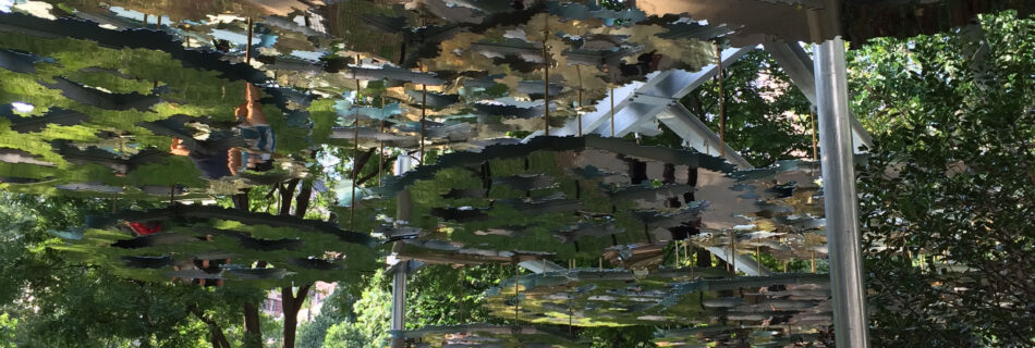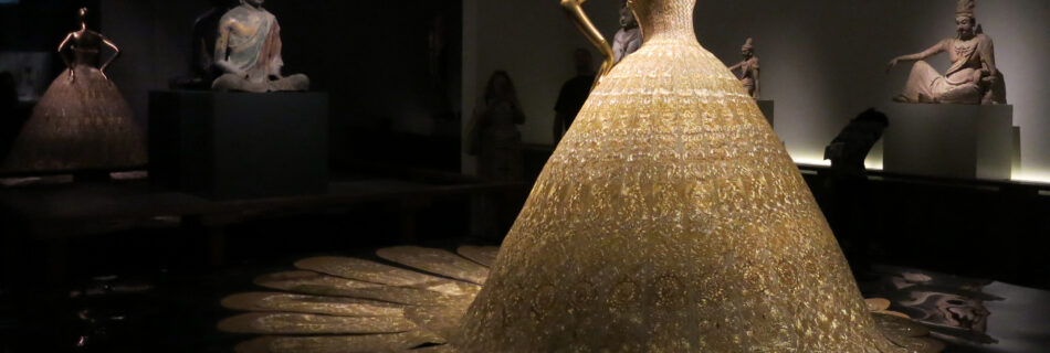 One of the most divine dresses in the Metropolitan Museum of Art’s exhibition of China-inspired Western fashions is this evening gown by Guo Pei in the museum’s Chinese Buddhist sculpture galleries. Though the model’s dress incorporates a lotus throne like the sculpture, it doesn’t seem to advocate any rejection of worldly pleasures. (Through Sept 7th).