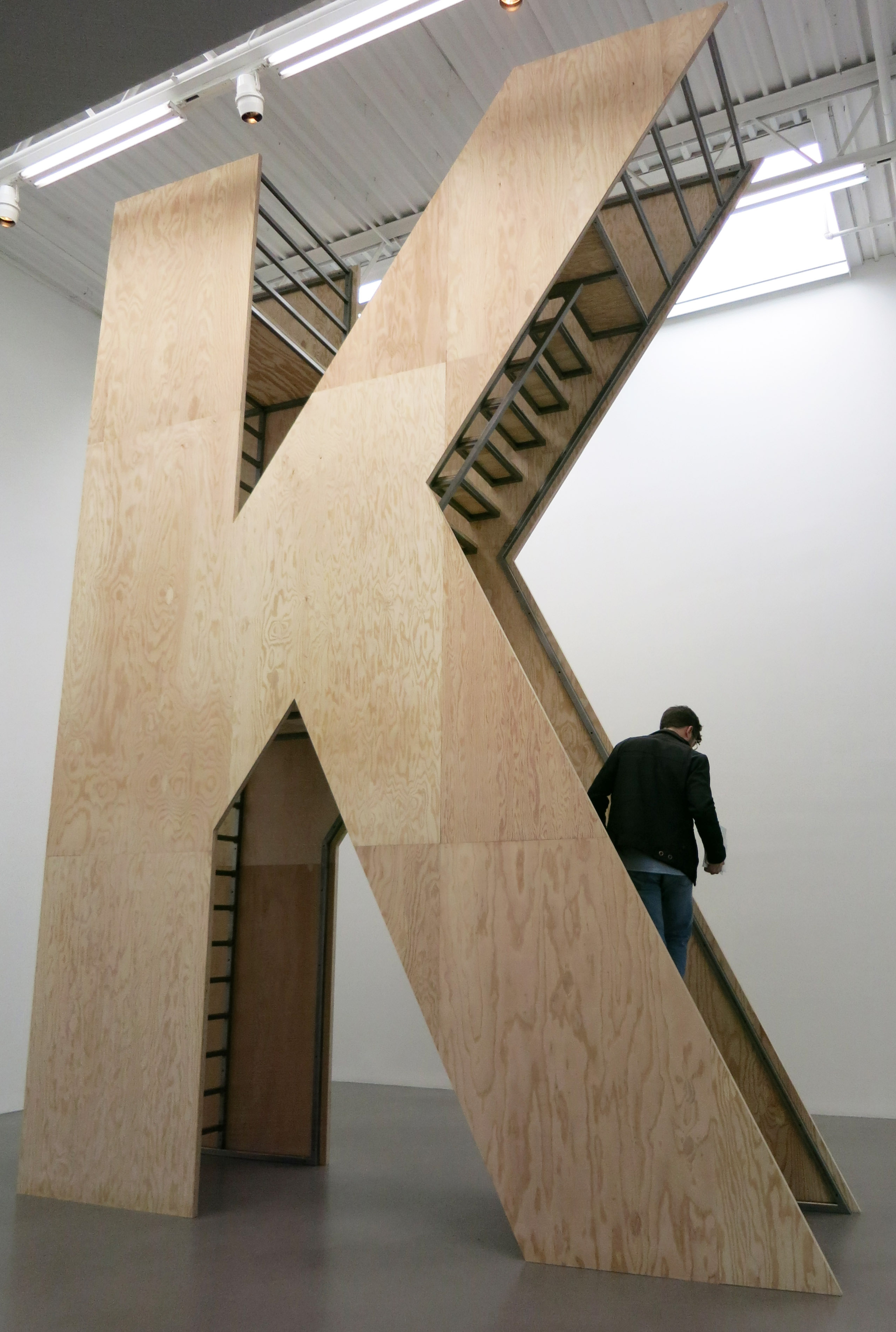 With oppressive systems as his theme, British artist Adam McEwan presents sculptures of supercomputers that move data, a rendition of airport security trays and this walk-in sculpture of the letter ‘K.’ The letter stands in for Kafka and a character in ‘The Trial’ as well as a hieroglyph for an open hand. The most convincing way to understand the mood of the piece, however, is to climb the terrifyingly steep stairs. (At Petzel Gallery through April 30th).