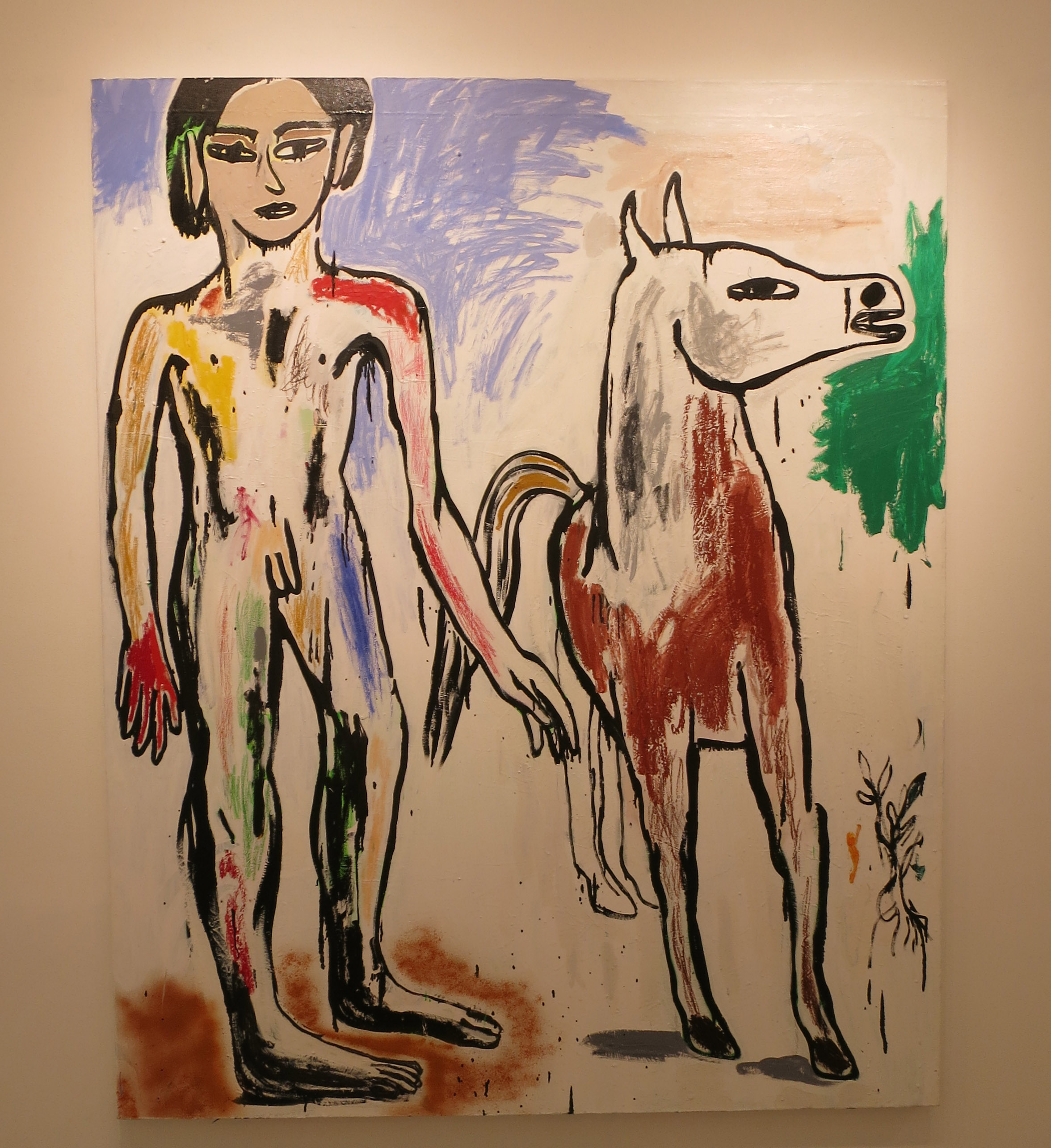 Spanish artist Cristina de Miguel offers an update on Picasso’s 1905-6 Boy Leading a Horse with a version that crops the boy (as if shot on film) and adds expressionist patches of color reminiscent of the post-war CoBrA group. The horse’s expression – he’s in on the joke? – adds humor. (At Freight and Volume on the Lower East Side through July 10th).