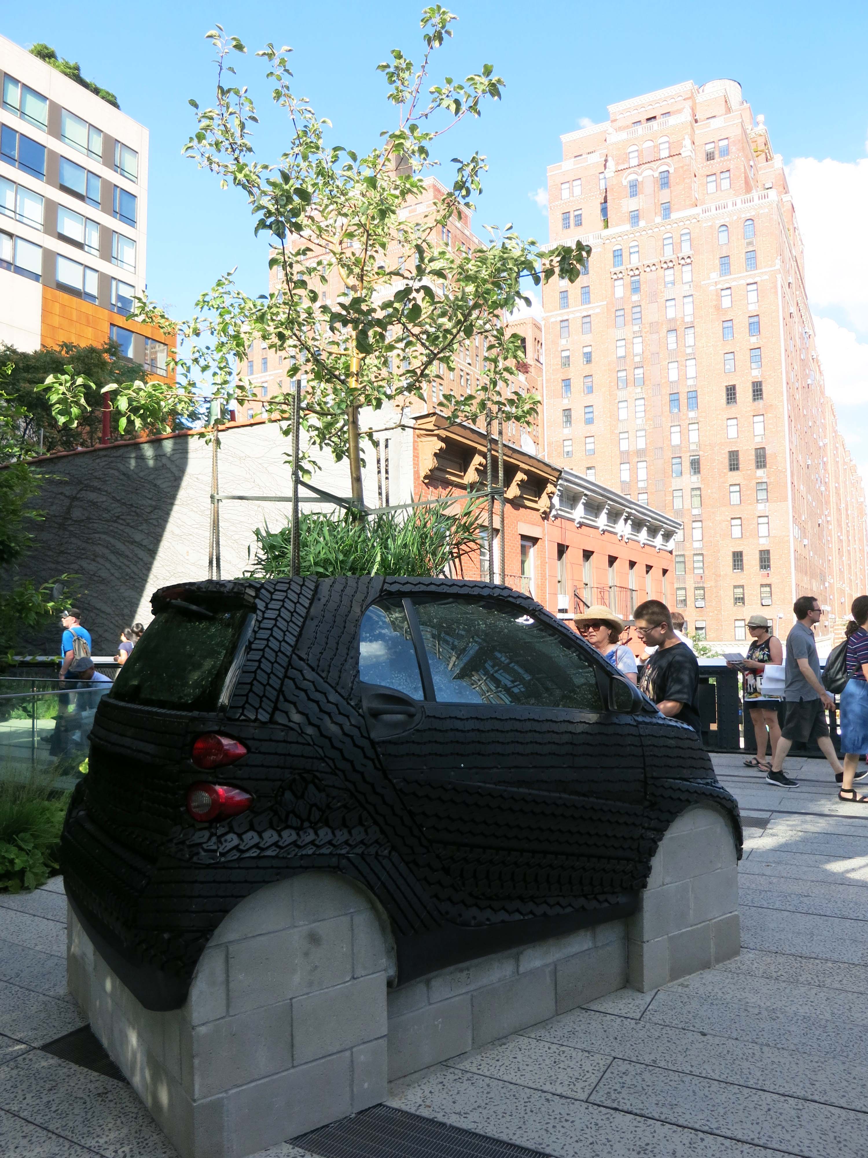 Smart cars snag great parking spaces in New York; this one, created by Harlem-based artist Nari Ward, enjoys a privileged place on the High Line where an admiring audience regularly surrounds it. Inspired by an abandoned car that hosted a lime tree in his father’s yard in Jamaica, Ward planted an apple tree in this car, lining the exterior with rubber tire treads and turning a symbol of nimble urban driving into a stationary support for nature. (On the High Line through March 2017).