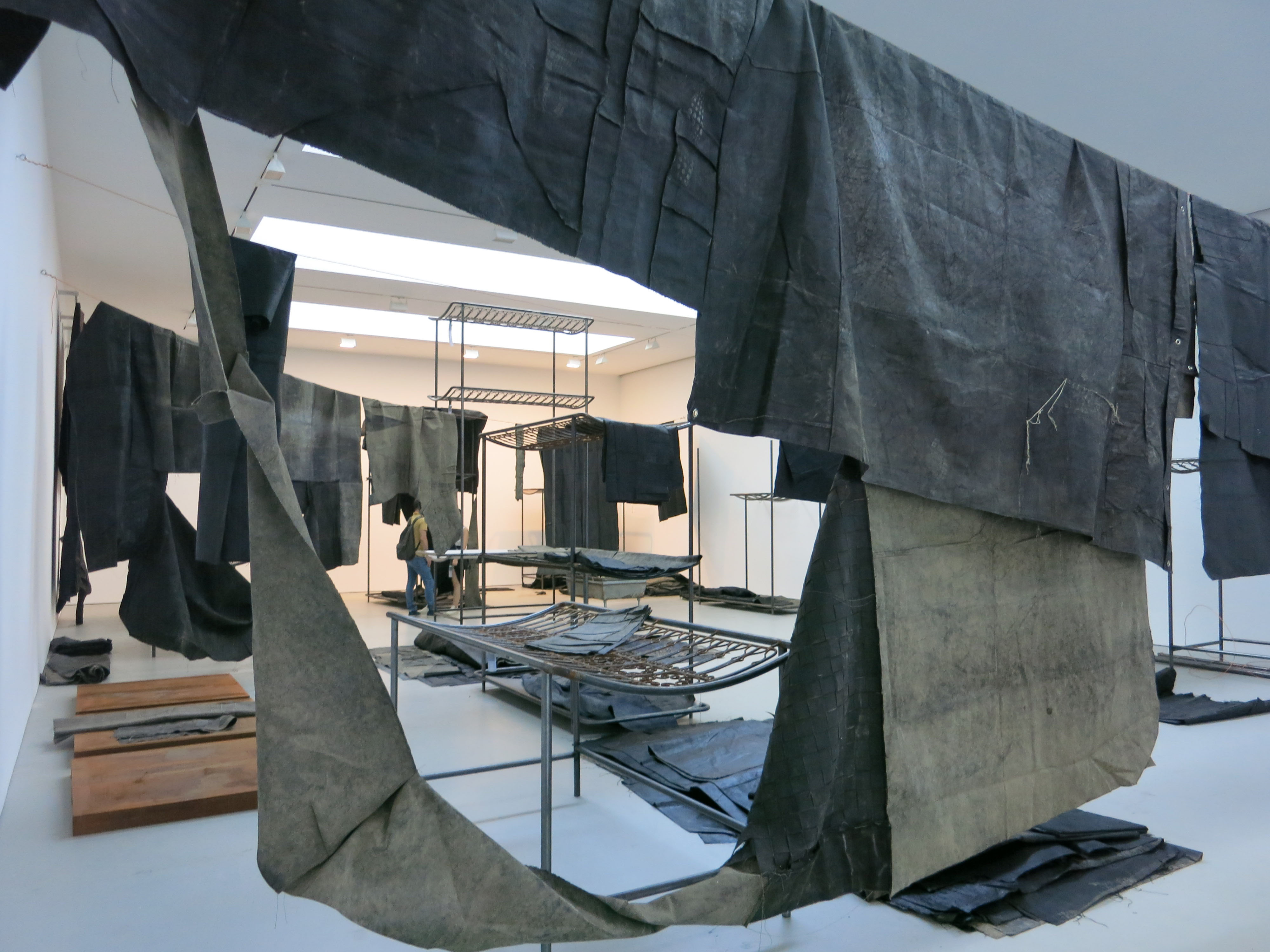 Black canvases, some formerly used as studio rags, hang from wires in David Zwirner Gallery’s Chelsea space in Oscar Murillo’s new installation, dividing the gallery into sections like a make-shift field hospital. Even more ominous are sculptures inspired by morgue tables and a huge torn canvas featuring a bank note. Both are a far cry from the artist’s last show – for which he created a chocolate factory in the gallery. (Through Oct 22nd).