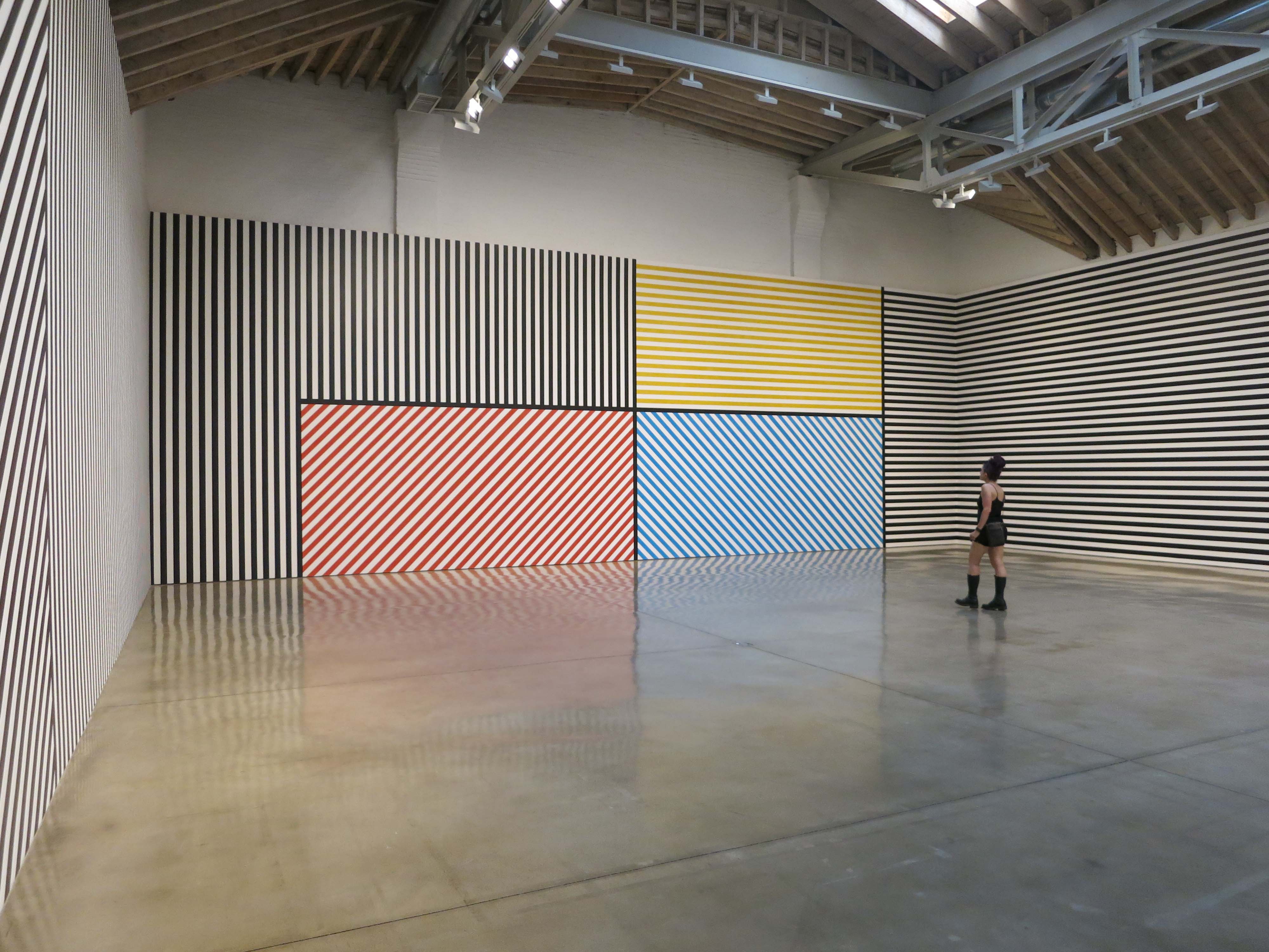 Sol LeWitt, Wall Drawing #368: The wall is divided vertically into five equal parts. The center part is divided horizontally and vertically into four equal parts. Within each part are three-inch (7.5 cm) wide parallel bands of lines in four directions in four colors. In each of the other parts, three-inch (7.5 cm) bands of lines in one of the four directions. The bands are drawn in color and India ink washes. Red, yellow, blue, ink, India ink 3” (7.5 cm) bands. First drawn by: Jo Watanabe and others. First installation: Walker Art Center, Minneapolis, MN, January 1982. India ink. dimensions variable.