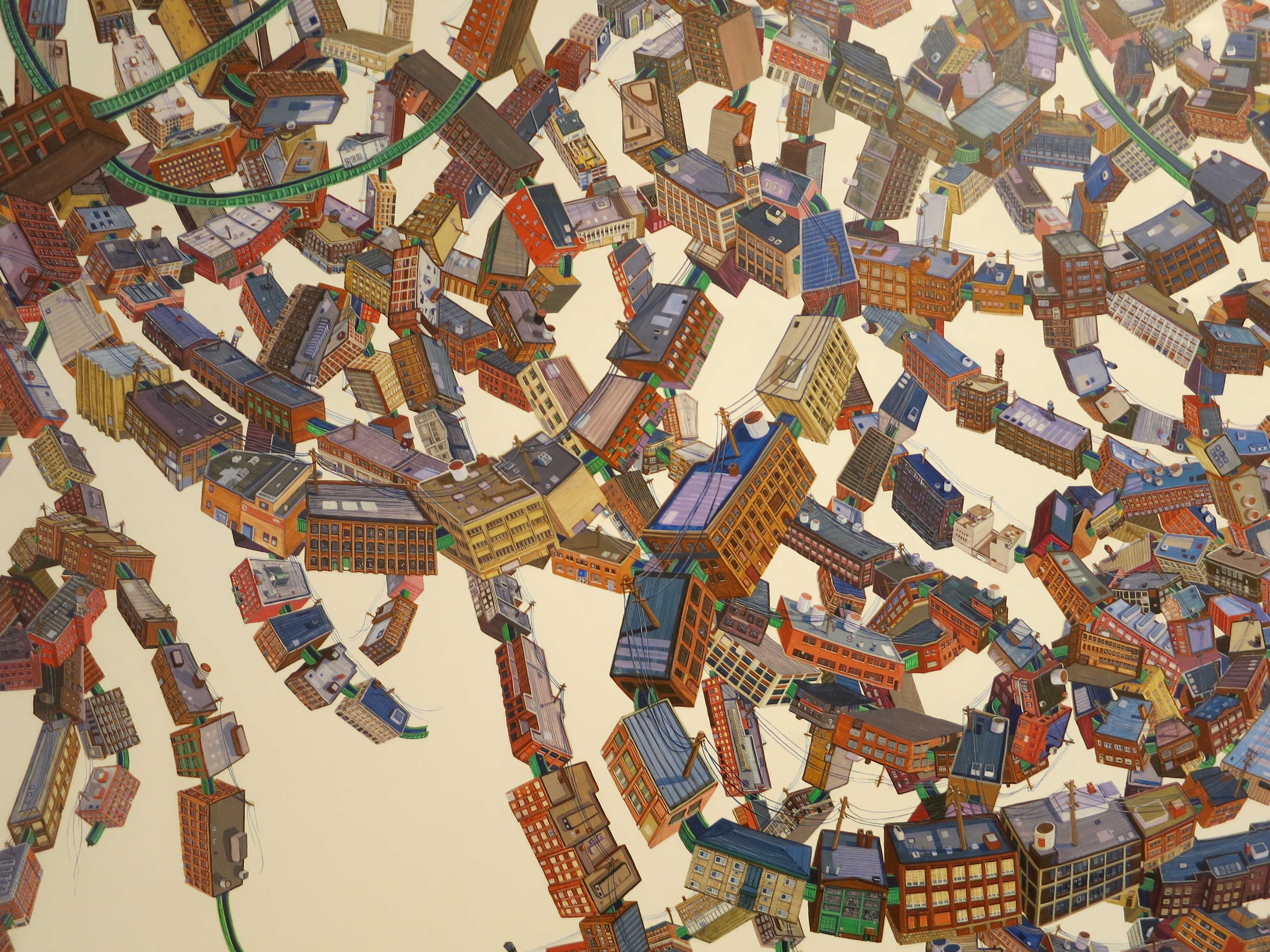 Walks and bus rides through Cleveland’s post-industrial landscape inspires Amy Casey’s amazingly intricate acrylic paintings. Here, the built environment mobilizes into twisted chains that evoke jewelry or a train set. (At Foley Gallery on the Lower East Side through Oct 30th).