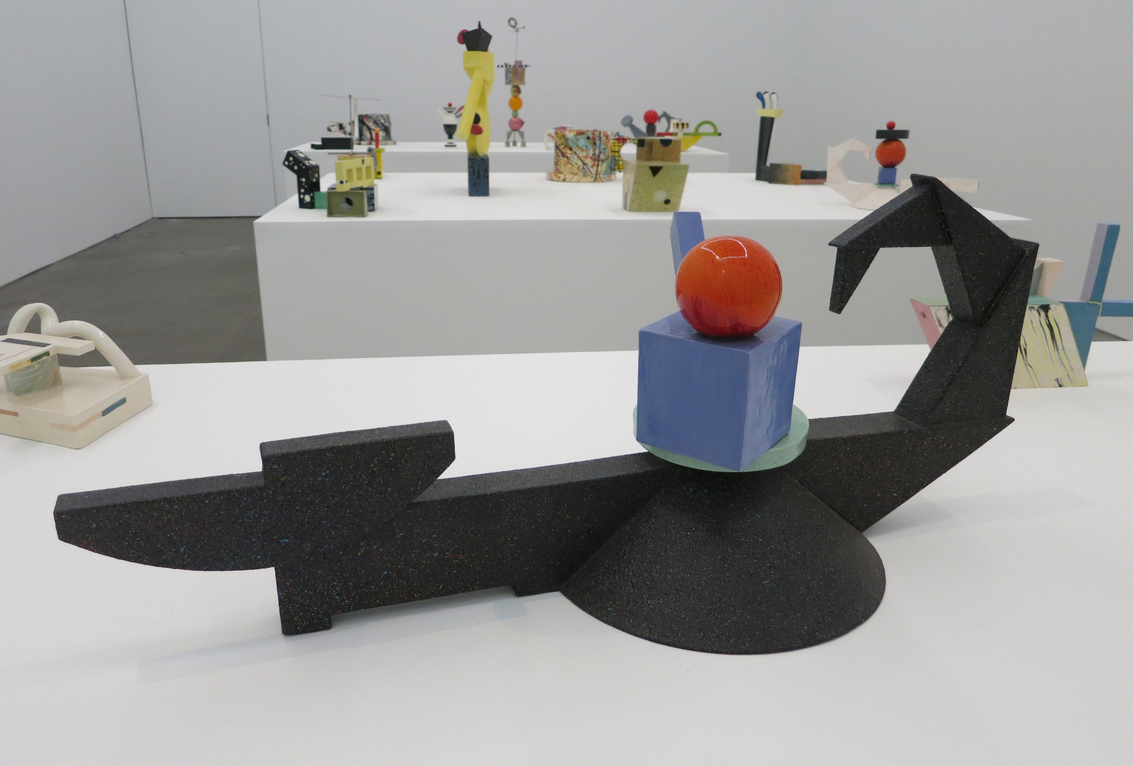 LA sculptor Peter Shire’s ‘Scorpion’ strikes a fencing pose, but something about the red ball on top of this exaggerated tea-pot shape tones down the menace. Behind it, other sculptures reveal Shire’s involvement with the Memphis design group in the 80s and his own sense of humor in a deeply enjoyable survey of the artist’s work from the 70s to the present. (At Derek Eller Gallery on the Lower East Side through Oct 9th).