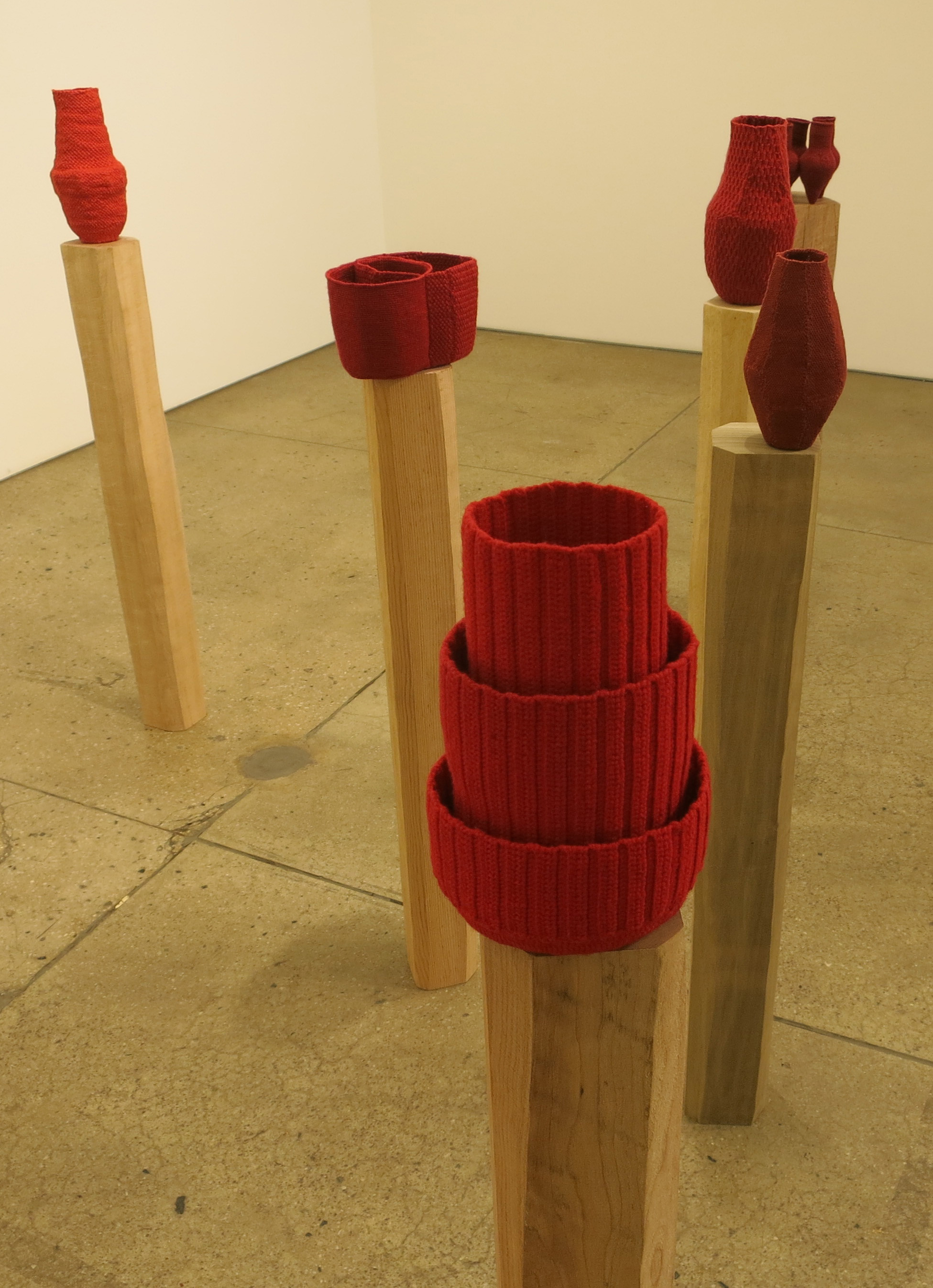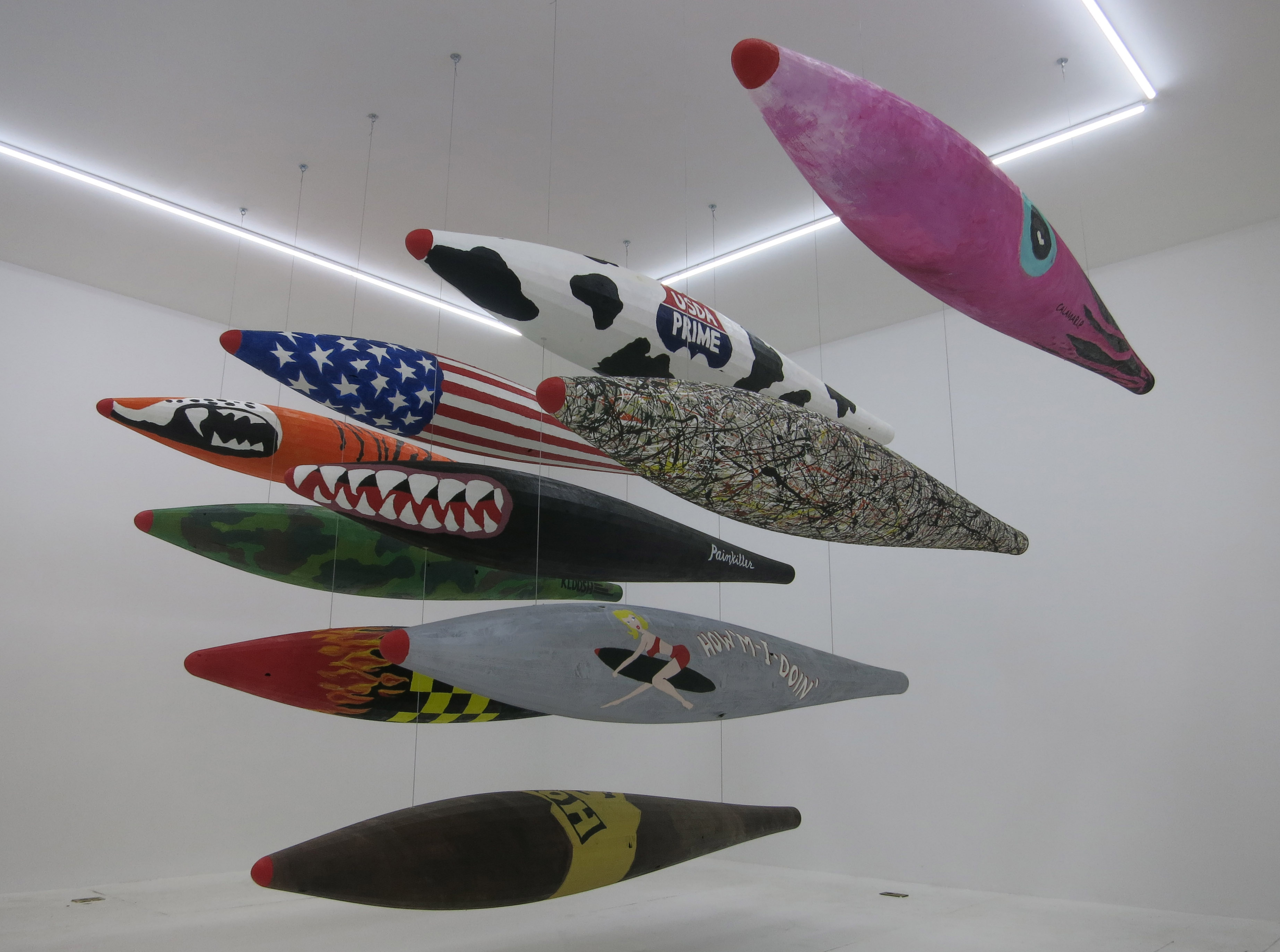 In a grouping of hand-painted wooden torpedoes, Marianne Vitale swaps out her signature bold, minimalist sculptures made with railway ties or battered wood for personalized weapons bearing ‘American’ symbols including USDA meat and Pollock-like swirls of paint. (At Invisible-Exports on the Lower East Side through Oct 16th).
