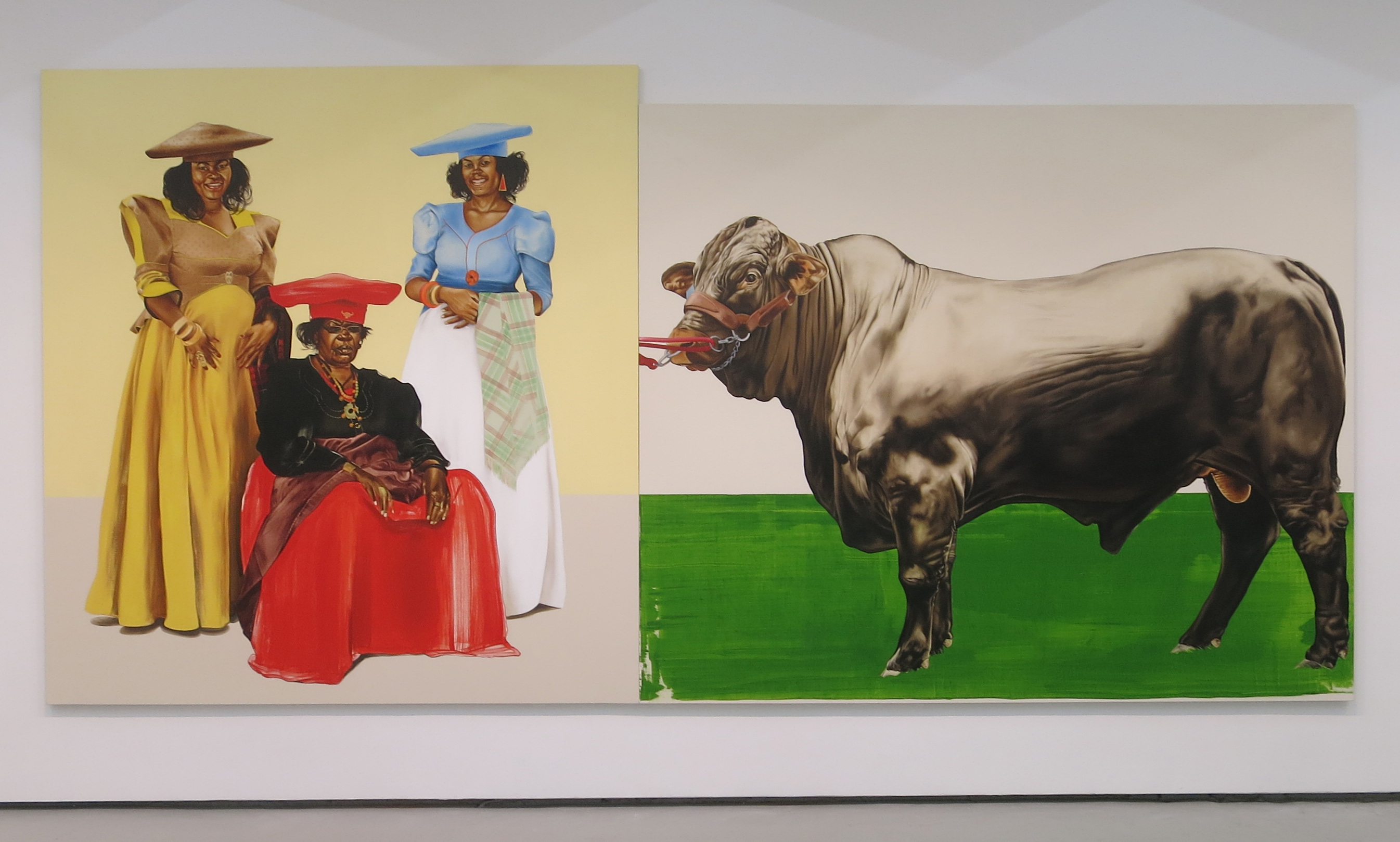 Meleko Mokgosi’s provocative pairing of three regal African women with a massive bull implies that we’re looking at two powerful forces. The diptych’s subtitle is ‘Lerato: Philia I’ the Setwana word for love (used as a noun in reference to a woman) followed by a suffix that brings to mind excessive devotion. (At Jack Shainman Gallery on 20th and 24th Streets through Oct 22nd).
