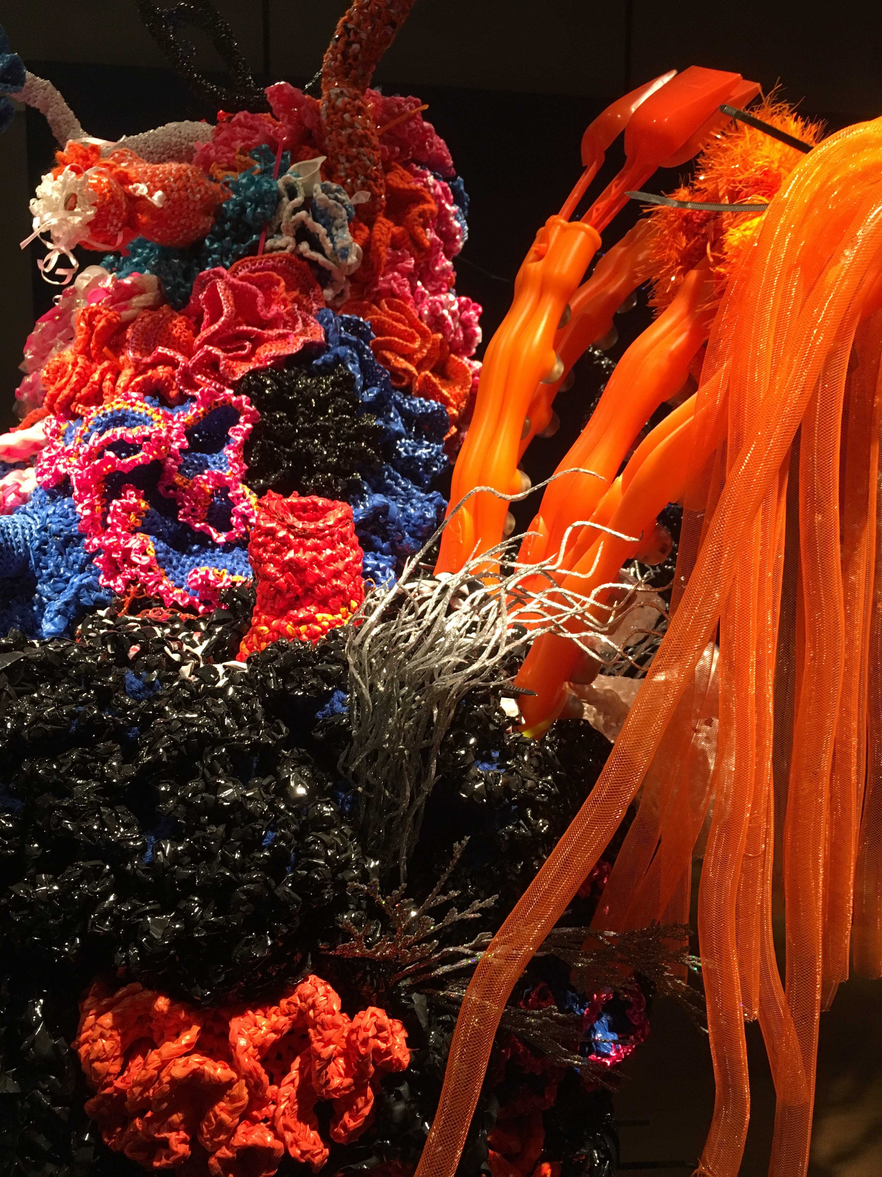 Christine Wertheim and Margaret Wertheim with Sarah Simons, Clare O’Callaghan, Kathleen Greco, Evelyn Hardin, Matthew Adnams, Christina Simons, and Jemima Wyman, (detail) Coral Forest – Ea, Plastic shopping bags, The New York Times wrappers, Hula-Hoop, plastic spades, found objects, yarn, felt, Sonotube, chicken wire, 2009 – 14.