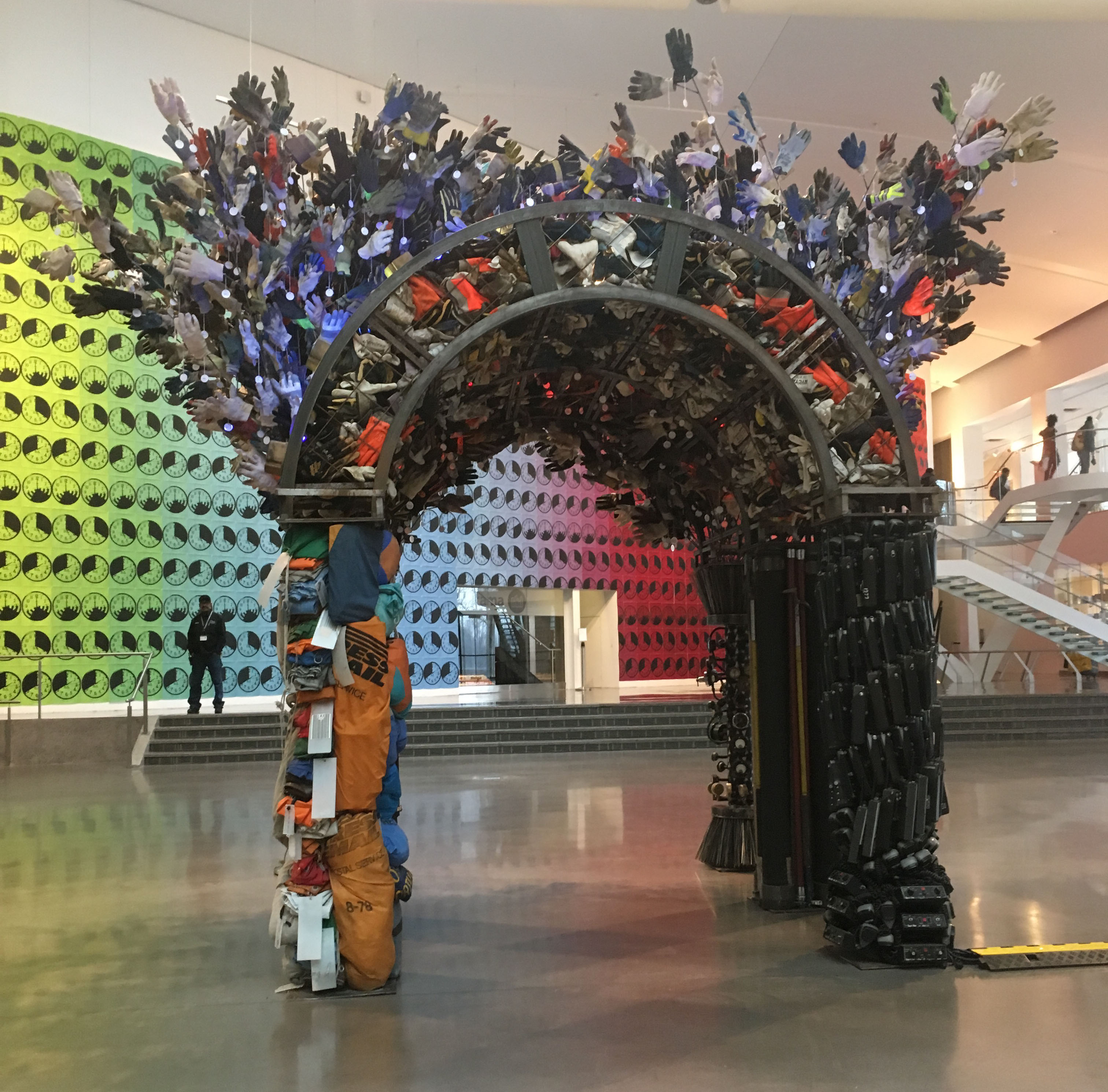 Mierle Laderman Ukeles, Ceremonial Arch IV, 5,000 + gloves donated from 10 urban organizations, in steel cages and on steel rods, situated over six columns wrought from materials donated from local and federal agencies, 1988/1993/1994/2016.