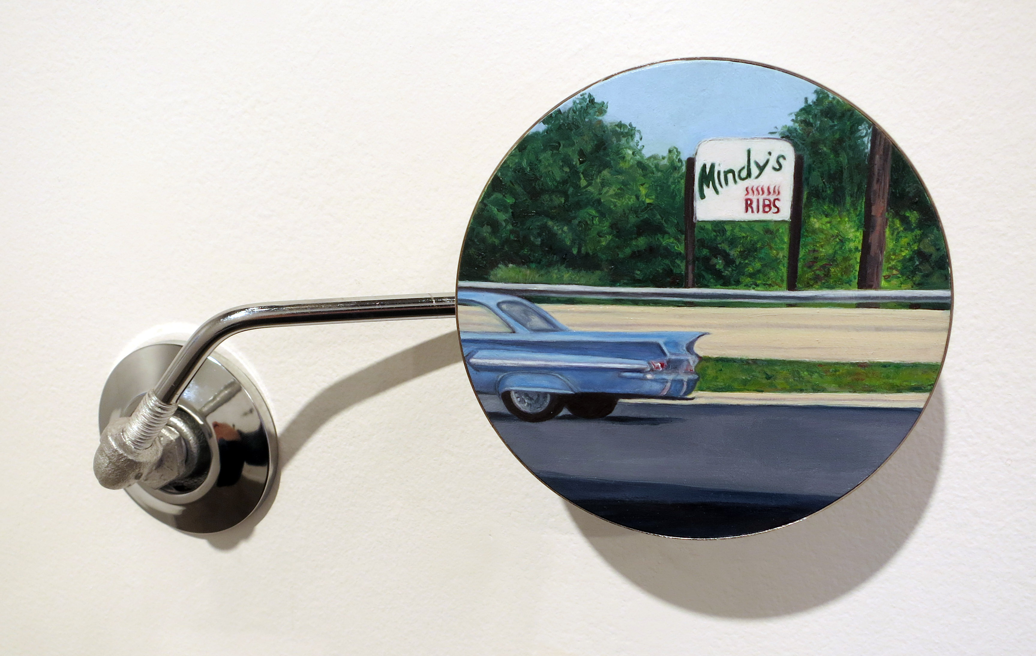 Edie Nadelhaft, Mindy’s (Modena, IL), oil on panel, vintage BMW mirror housing, 4.25 inches diameter, 2017.