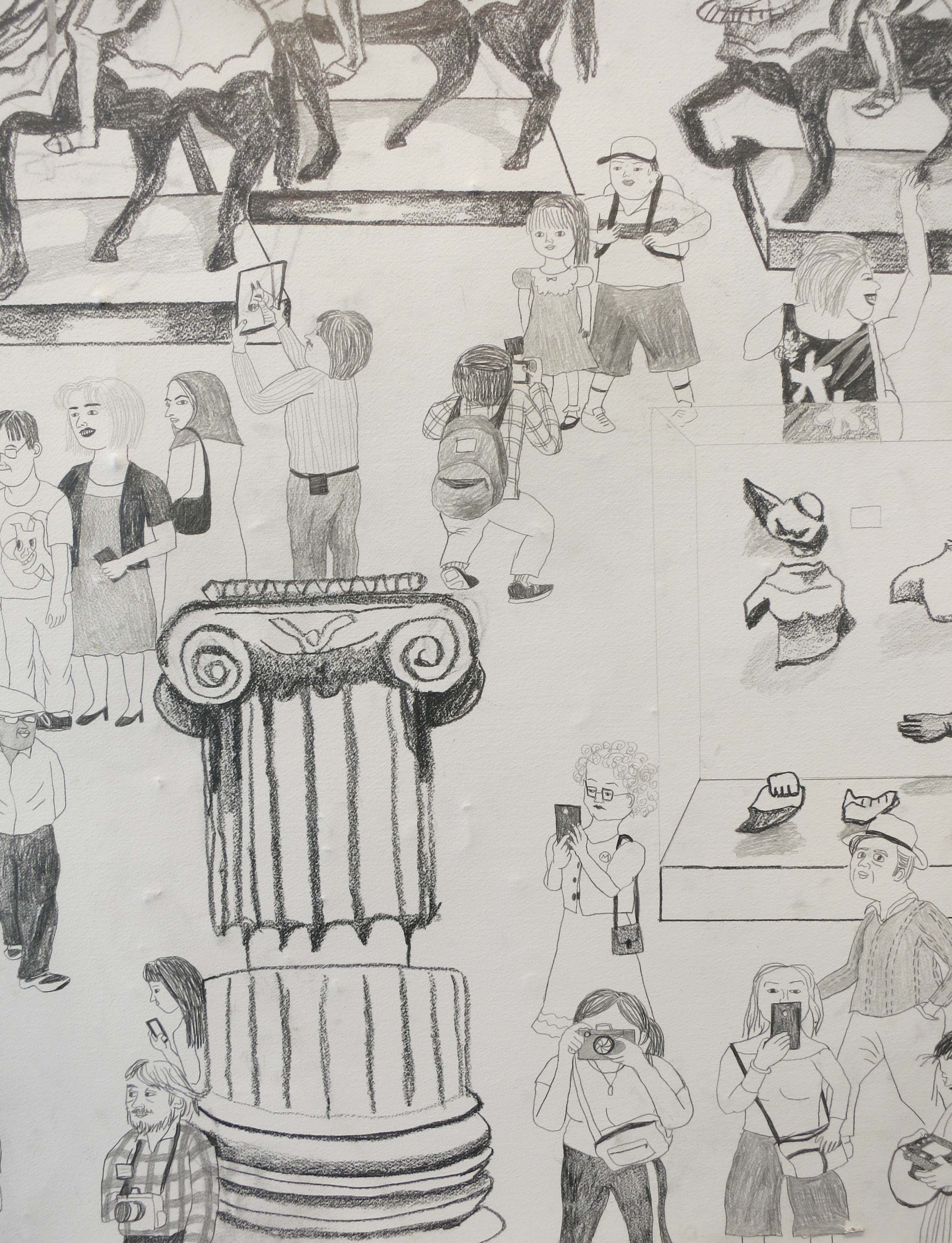 Phones, cameras and iPads outnumber art objects in Hai-Hsin Huang’s mash-up of Metropolitan Museum of Art treasures, ogled by visitors jockeying for snapshots and selfies. In this detail, a massive, 2,300 year old marble column from the Temple of Artemis at Sardis fails to attract much attention, begging the question of a museum’s purpose in today’s photo obsessed culture. (At Danese Corey Gallery in Chelsea through Feb 4th).