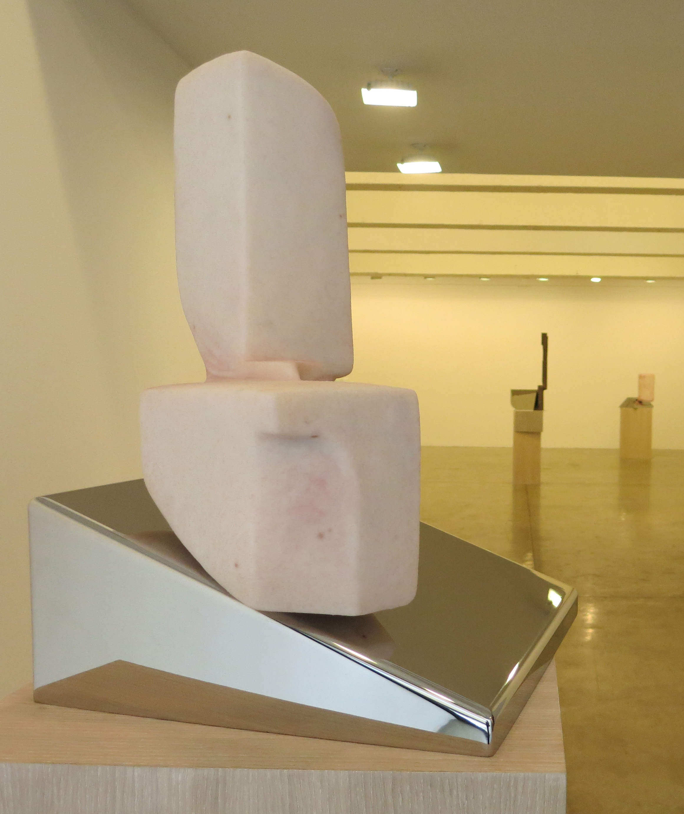 Mid-20th century American minimalist sculptors rebelled against the relationship of parts in Anthony Caro’s abstract sculptures; later in life, Caro was the one to break out, introducing Perspex into his sculptures when he was in his mid-80s. Here, a thick sheet of clear Perspex turns two pieces of rusted steel into characters in an untold story –a customer and a bank teller, or a prisoner and her visitor? (At Mitchell-Innes & Nash Gallery in Chelsea on the Upper East Side through Feb 4th).
