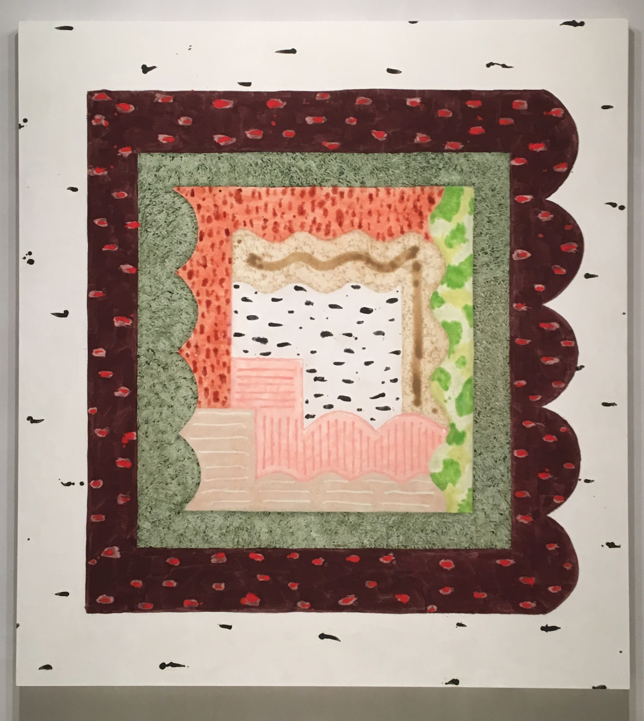 Abstract painter Rebecca Morris shows canvases controlled by a grid and, by contrast, images in which forms float freely in a selection of work at Mary Boone Gallery’s 57th Street location. In pieces like this untitled oil on canvas, Morris’ organizational strategy occupies a middle ground as recurring scallop-edged shapes nestle into each other, appearing to both advance towards us and recede. A white border flecked with black recalling ermine fur and a center that brings Dalmatians to mind create associations that drive contemplation. (On view through Feb 25th).