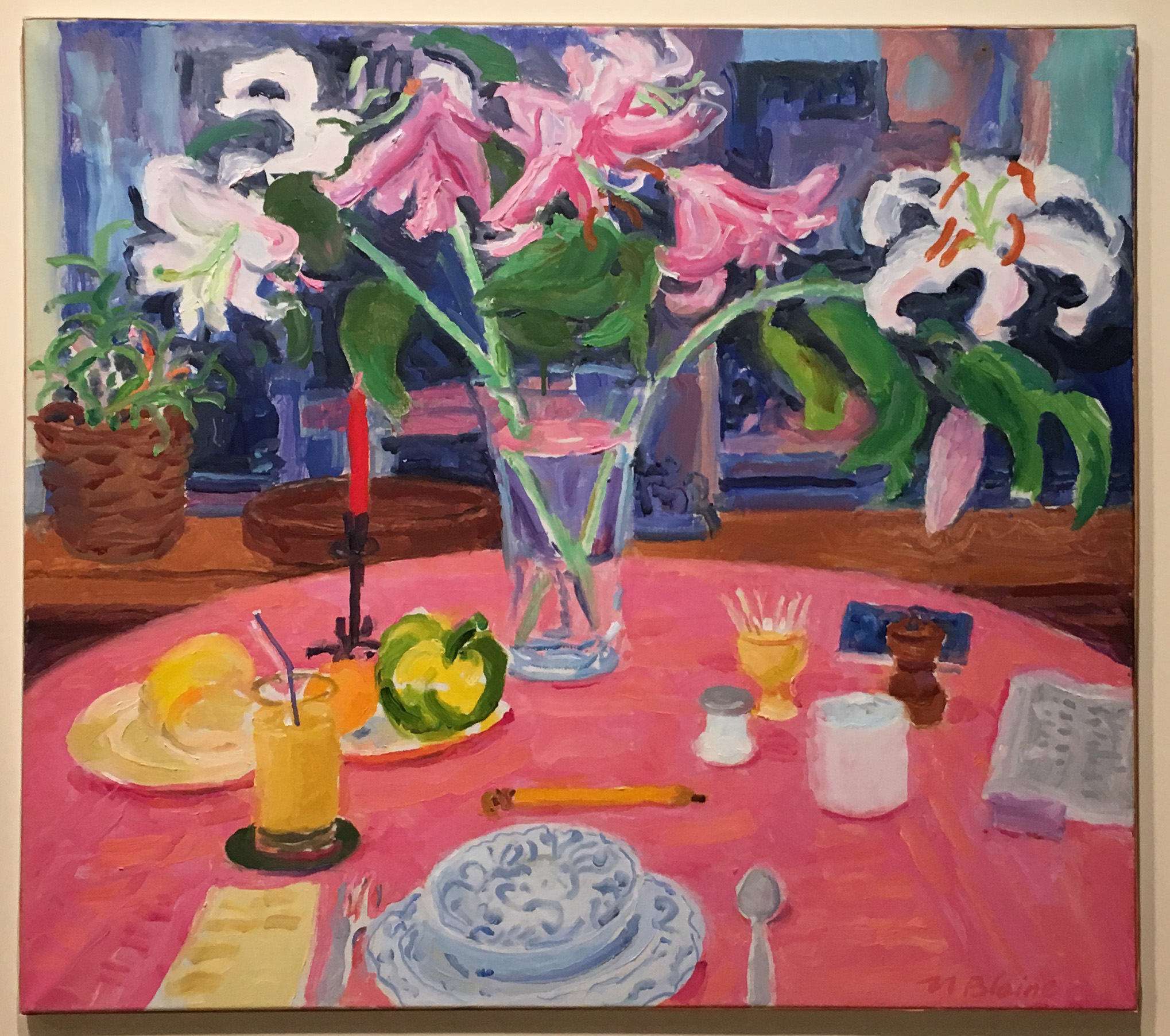 Nell Blaine, White Lilies, Pink Cloth, oil on canvas, 24 x 27 inches, 1990.