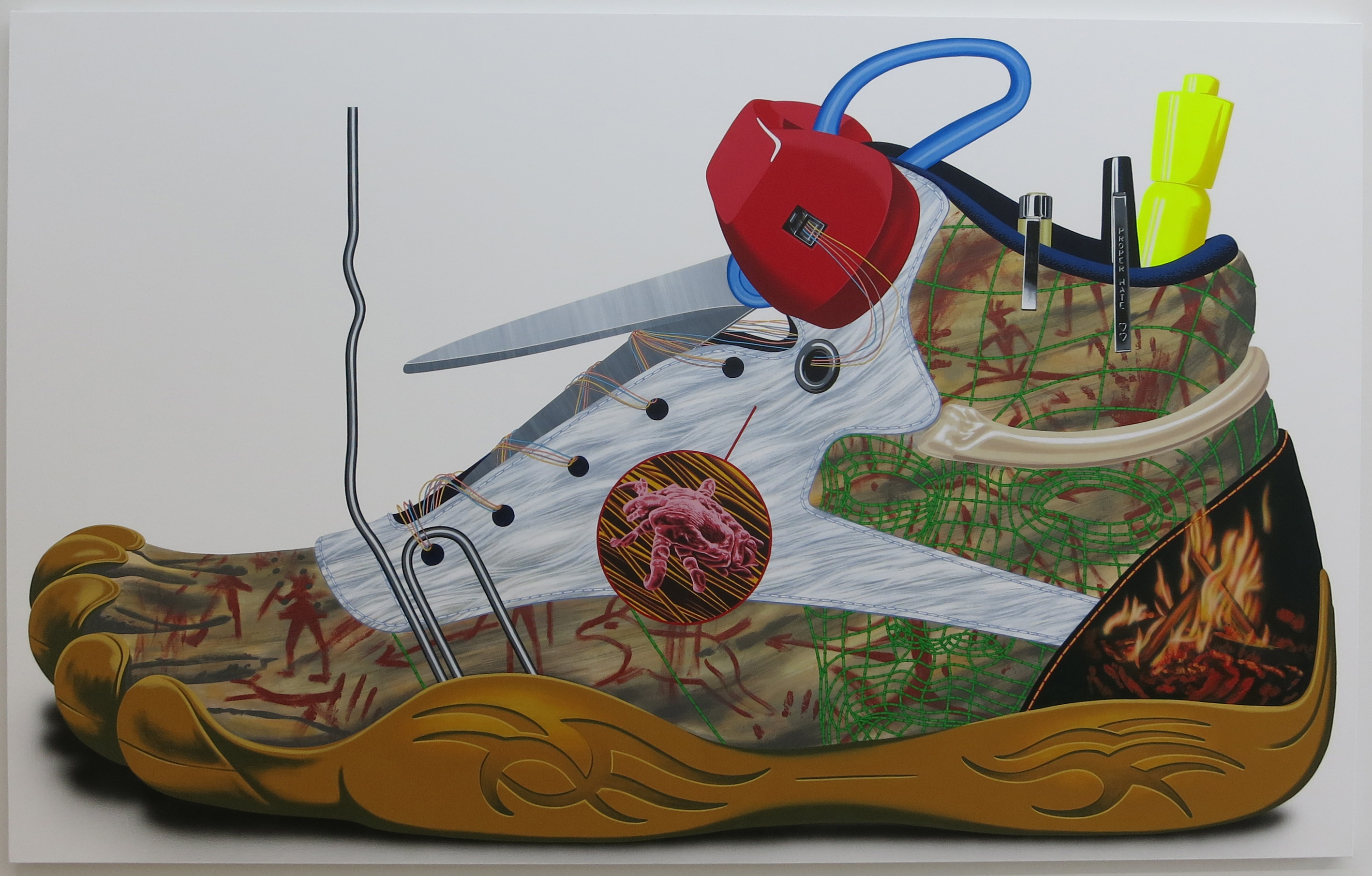 Fit for a student or a teacher, this monumental painted shoe not only holds scissors, pens and other school supplies, it’s a history lesson all on its own, from the cave paintings to a digitally rendered portrait in green lines. Titled after Magritte’s Le Modele Rouge (a painting of boots that take on the appearance of bare feet), Henry Gunderson’s update is more practical than surreal, but no less fun to ponder. (At 247365 Gallery on the Lower East Side through Feb 5th).