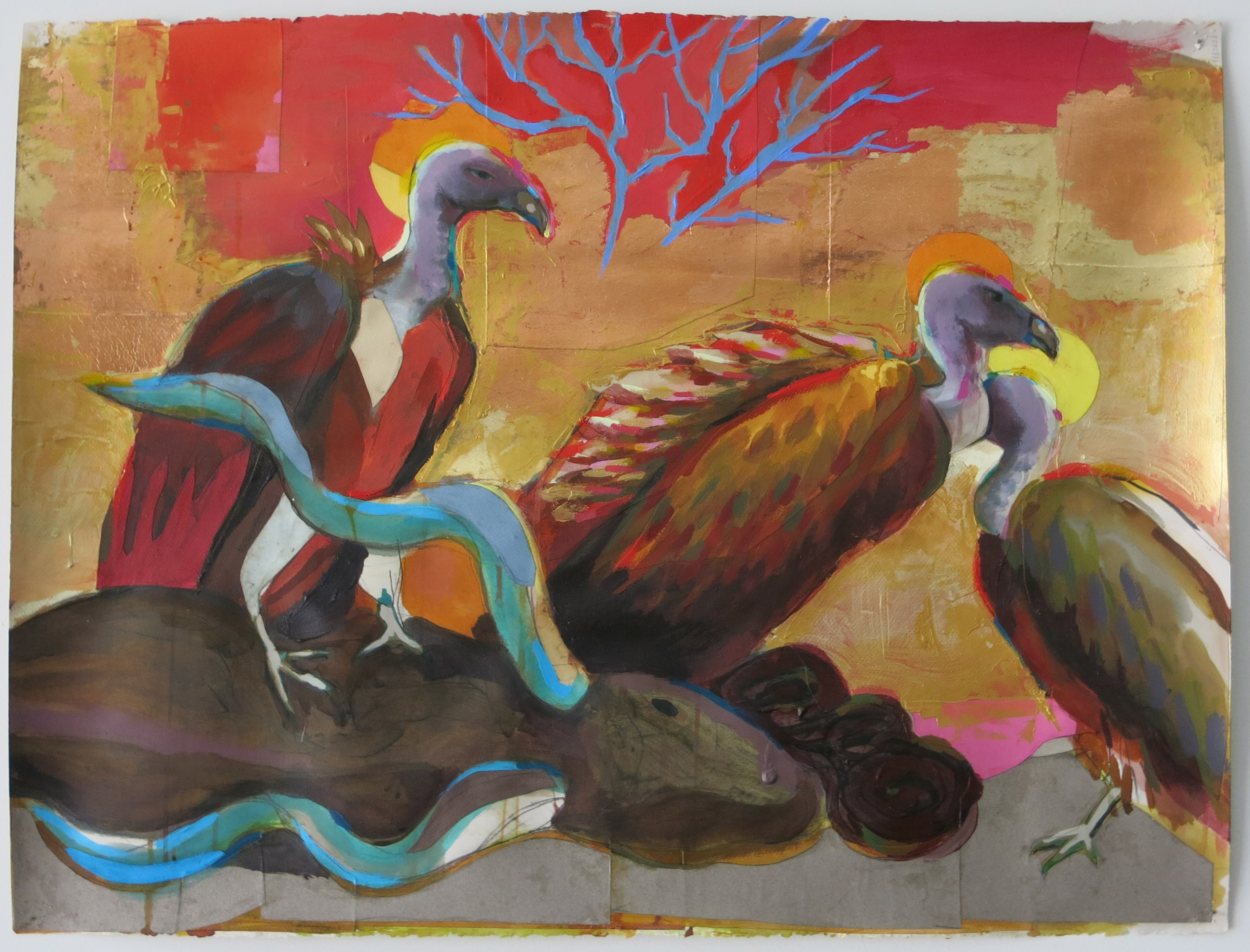 Karen Heagle, Untitled Scene (three vultures and a carcass), acrylic, ink, collage, gold and copper leaf on paper, 22 ½ x 29 ½ inches, 2016.
