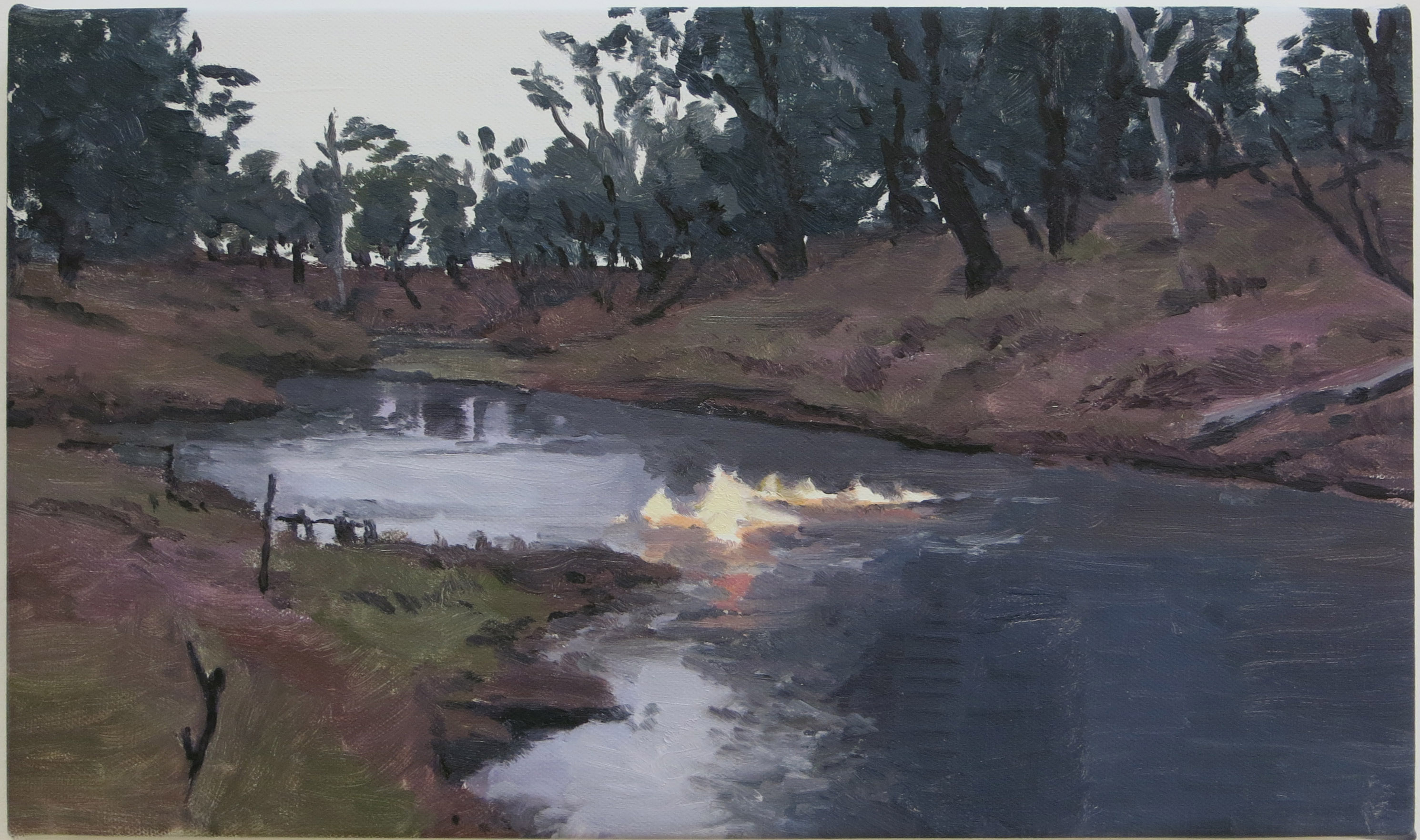 Roger White, Touristic Scene with Burning River, oil on canvas, 10 x 17 inches, 2017.