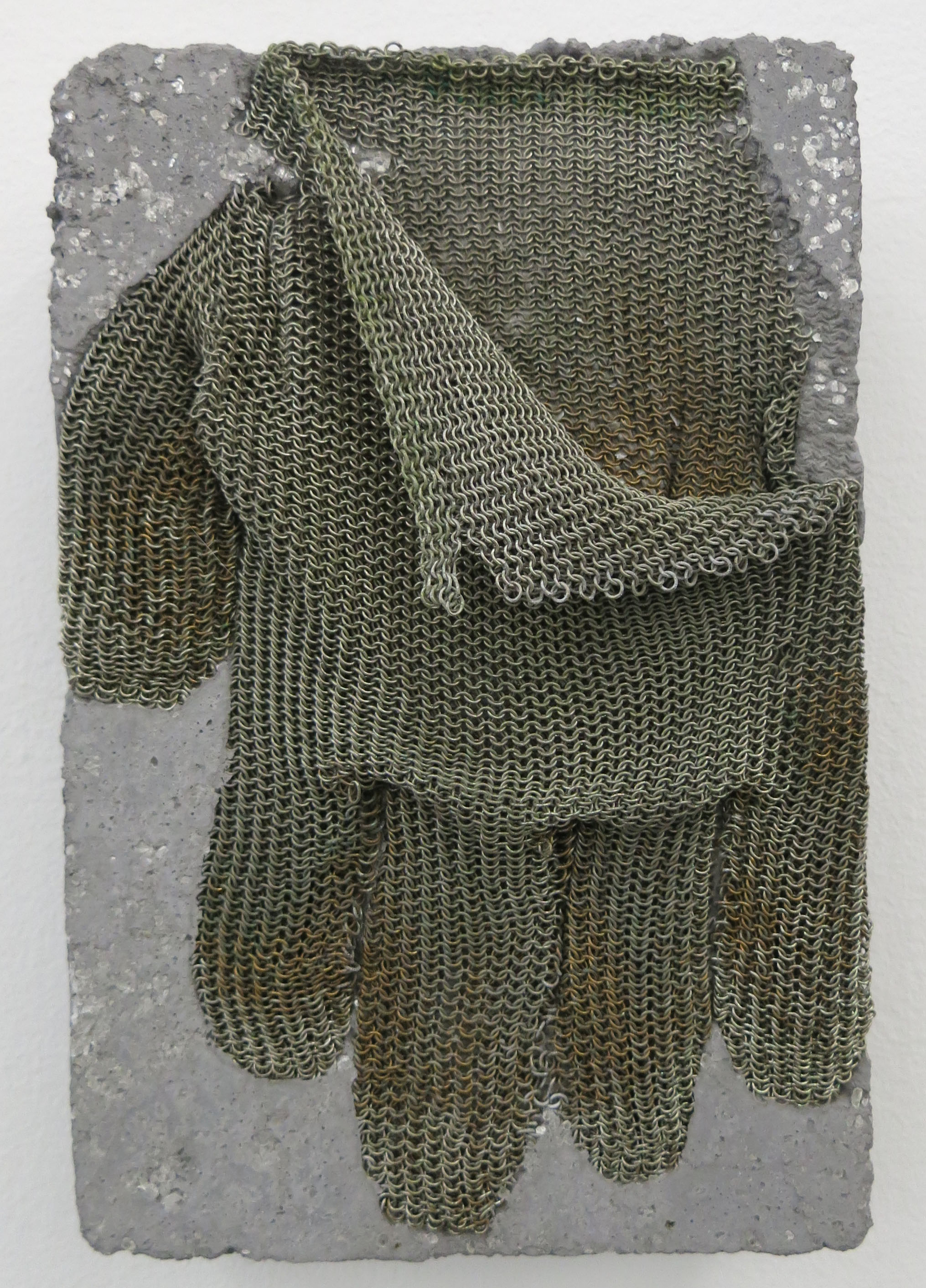 While a single glove evokes Michael Jackson in the glitter of stage lights, this lone accessory – a stainless steel mesh glove encased in concrete – conveys something sinister. Semo’s other minimalist sculptures co-opt possible residue of violence, including chains, broken glass and shell casings as art materials, asking how fine art and conflict connect. (At Marlborough Gallery in Chelsea through Jan 14th).