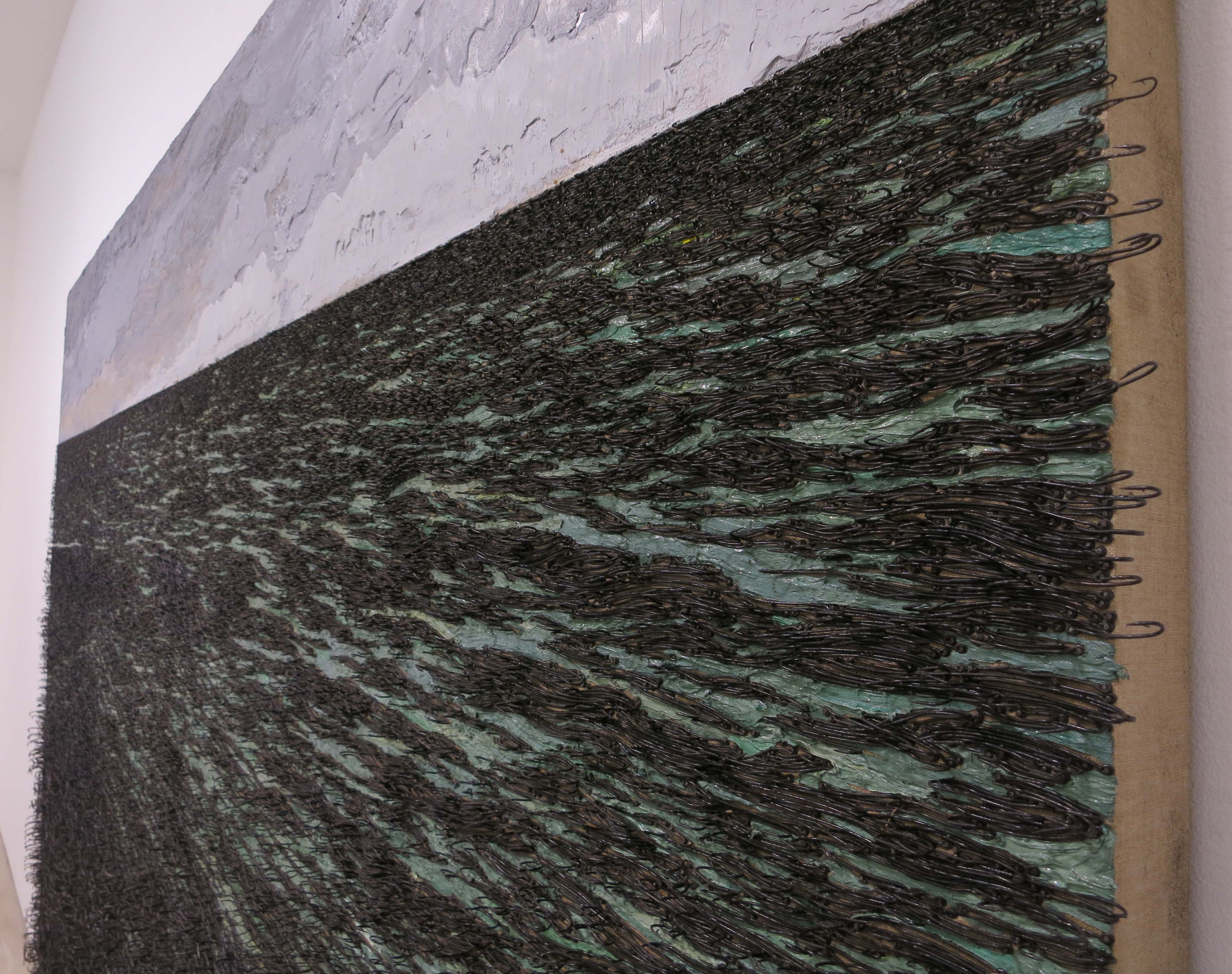 Green Caribbean waters turn menacing under steely grey skies, their currents outlined in rows of fishhooks in this meditation on isolation by Cuban artist Yoan Capote. (At Jack Shainman Gallery’s 24th Street location in Chelsea through March 11th).
