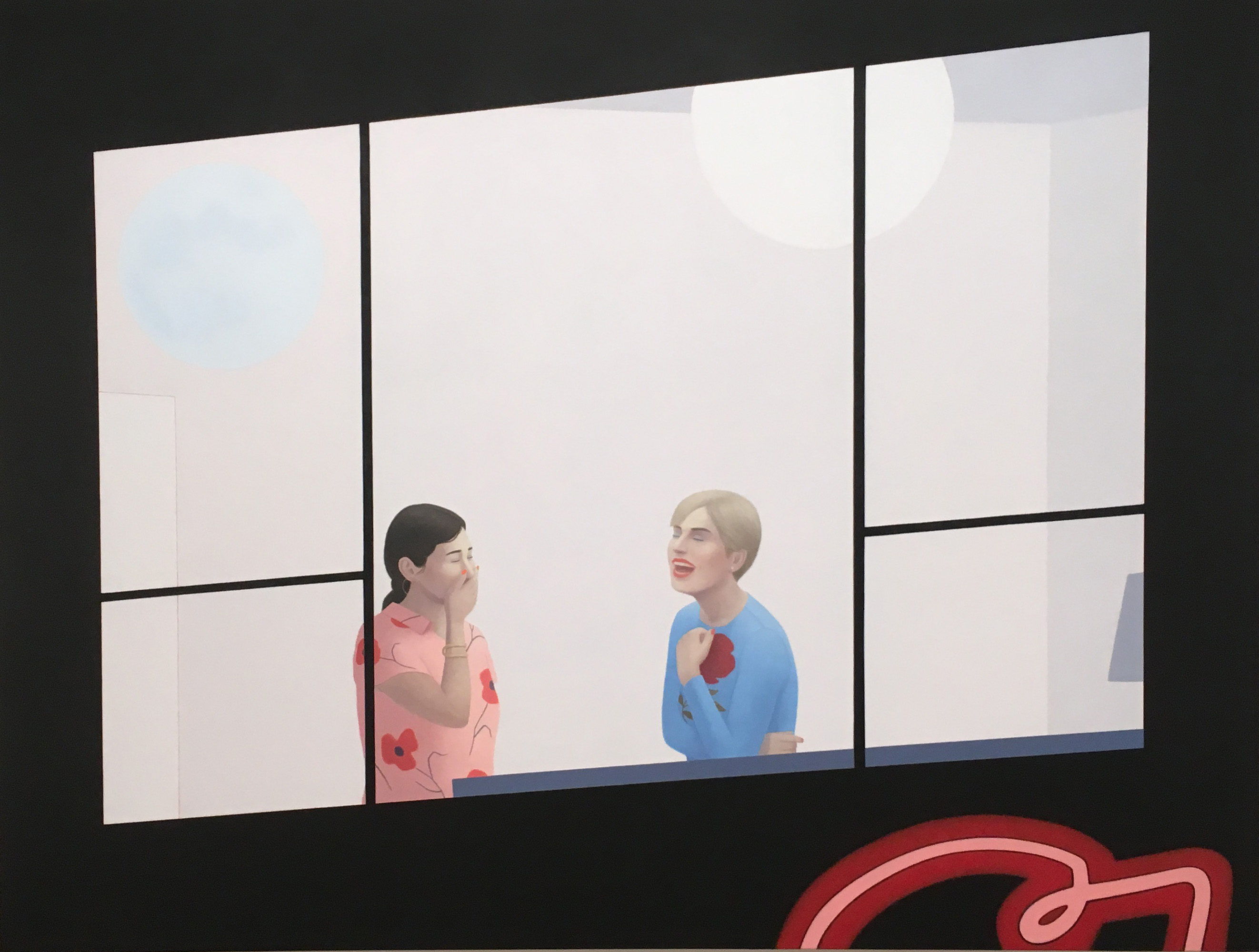 Marinaro Gallery’s huge 2nd floor windows invite glimpses from the street of the artwork inside; upstairs on the gallery wall, Ridley Howard occupies a similar vantage point in ‘Over the Star’ as he portrays two women with guarded postures laughing together. Awkward or intimate, their joke is irresistible, inviting us to keep watching. (At Marinaro Gallery on the Lower East Side through June 18th).