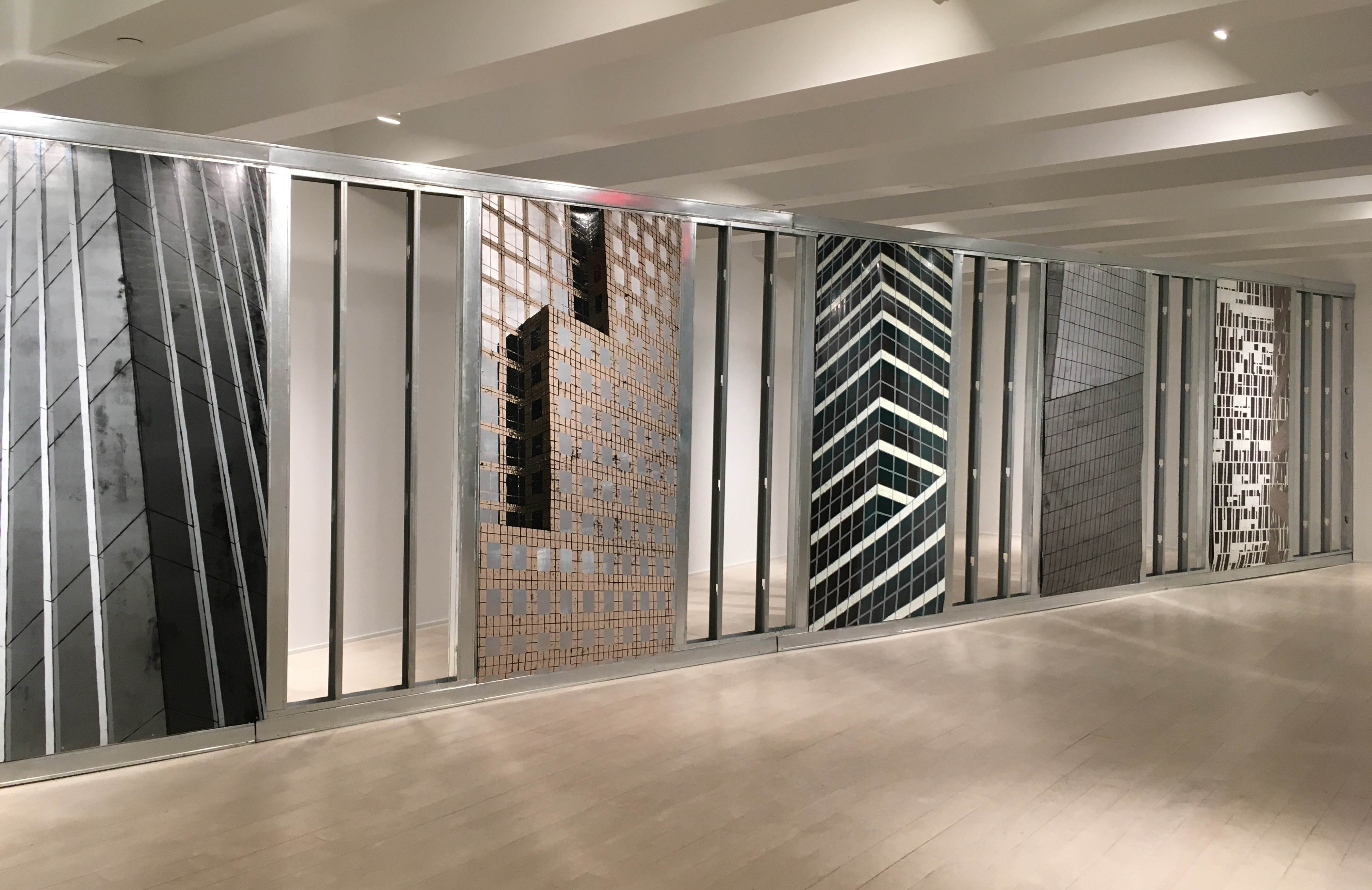 Nicola Lopez mixes interior and exterior walls, façade and skeleton in her bold installation at Jacob Lewis Gallery in Chelsea. Titled ‘Big Windows: Skin: Portals’ Lopez questions the impenetrable quality of anonymous modern glass wall architecture, mounting woodcuts on normally hidden metal studs that support interior walls. (On view through June 30th).