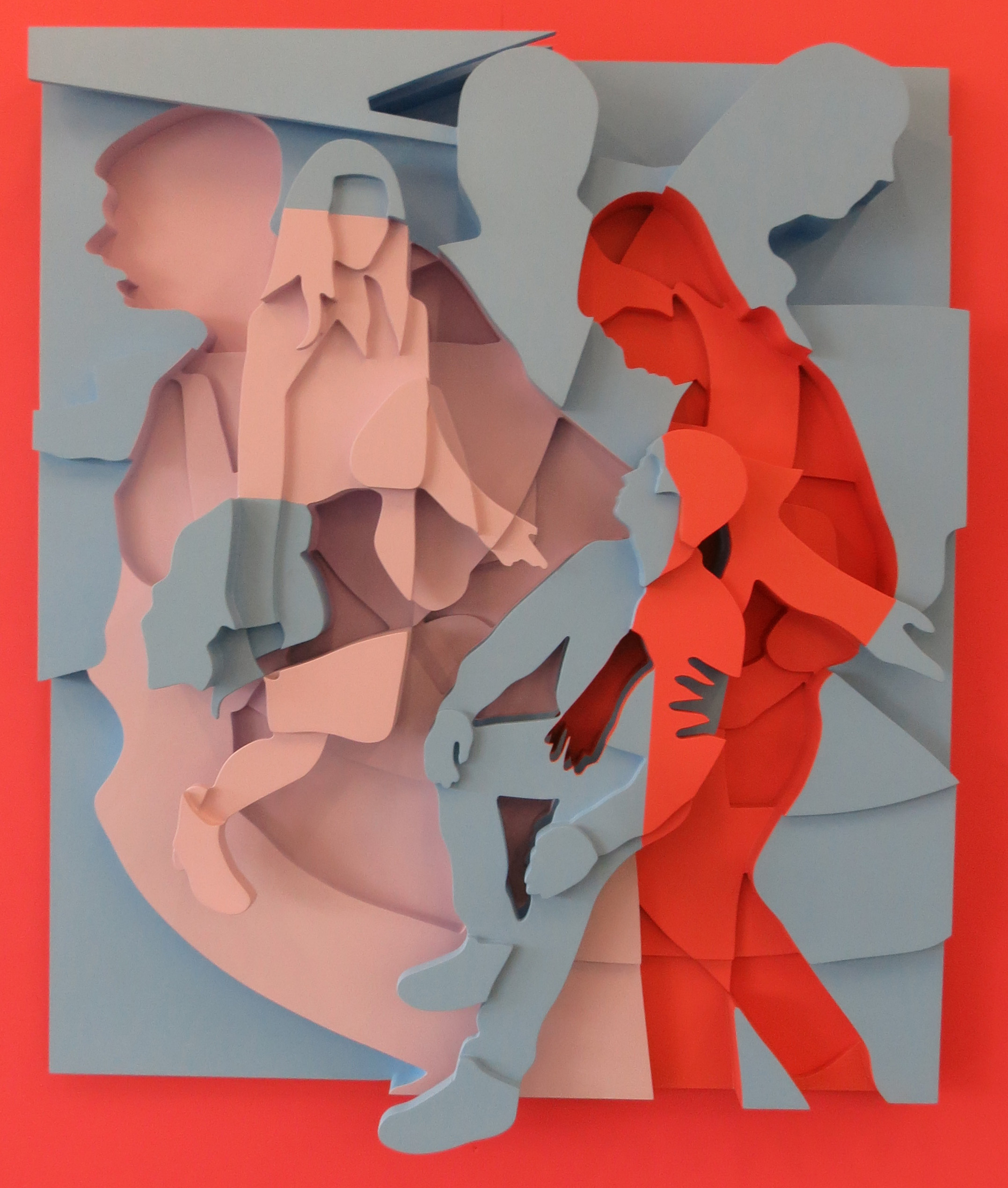 How do you make representational painting in the digital age, when bodies no longer have to be near each other to interact? Pieter Schoolwerth ponders this in a multi-step process that involves photographing figures and shadows, drawing them, altering them in the computer, creating them in foam core or wood and printing and painting on canvas. The resulting images are convincingly attractive but unsatisfying – in this enigmatic relief sculpture depicting a student center, various figures are together but don’t connect. (At Miguel Abreu Gallery on the Lower East Side through June 28th).