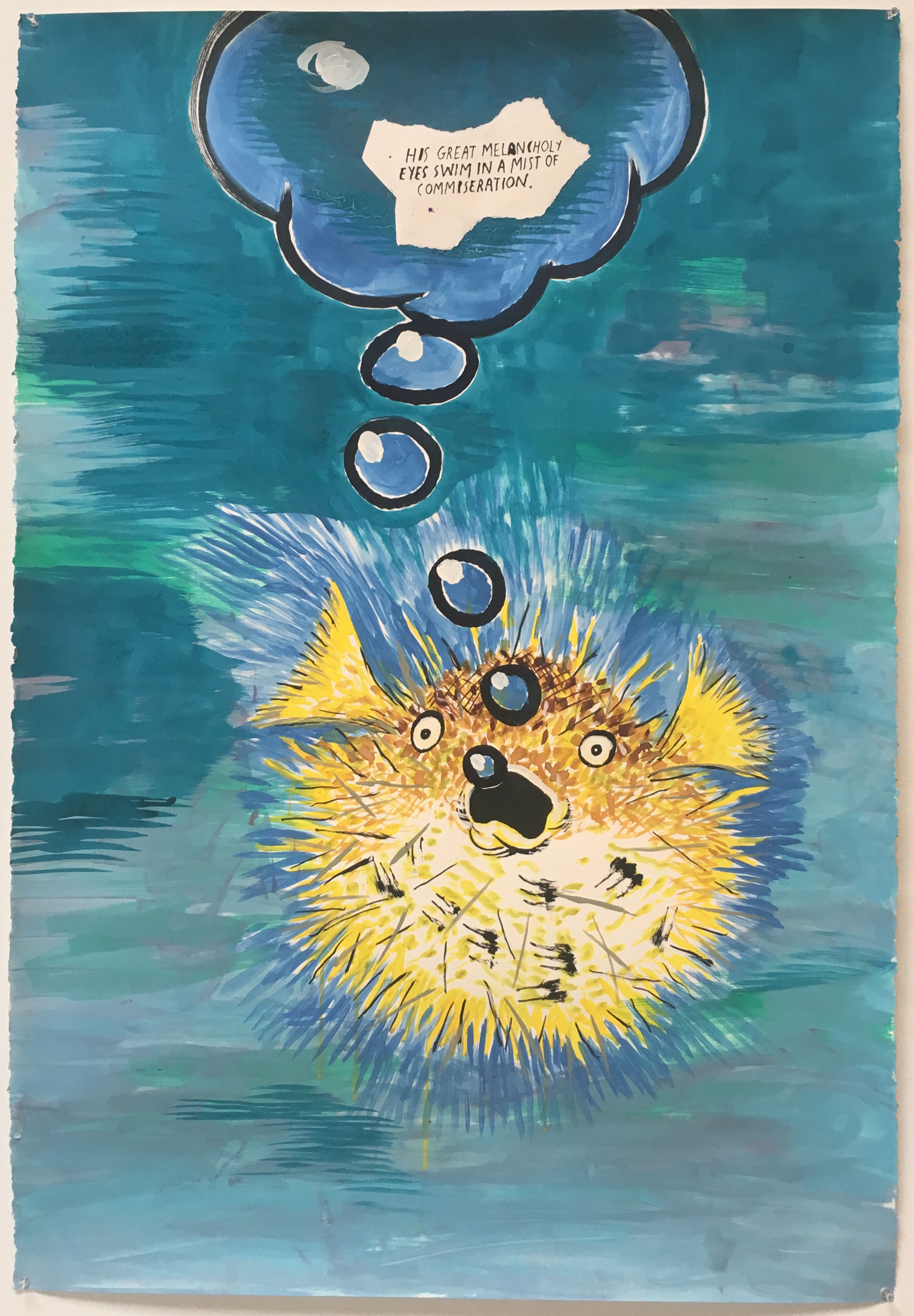 This comically alarmed puffer fish is apparently startled by the empathy of an unnamed individual; in a thought bubble, the fish remarks that ‘his great melancholy eyes swim in a mist of commiseration.’ As comment on warming seas and endangered wildlife, the painting pits emotion vs action. (At David Zwirner Gallery’s 519 West 19th Street location).