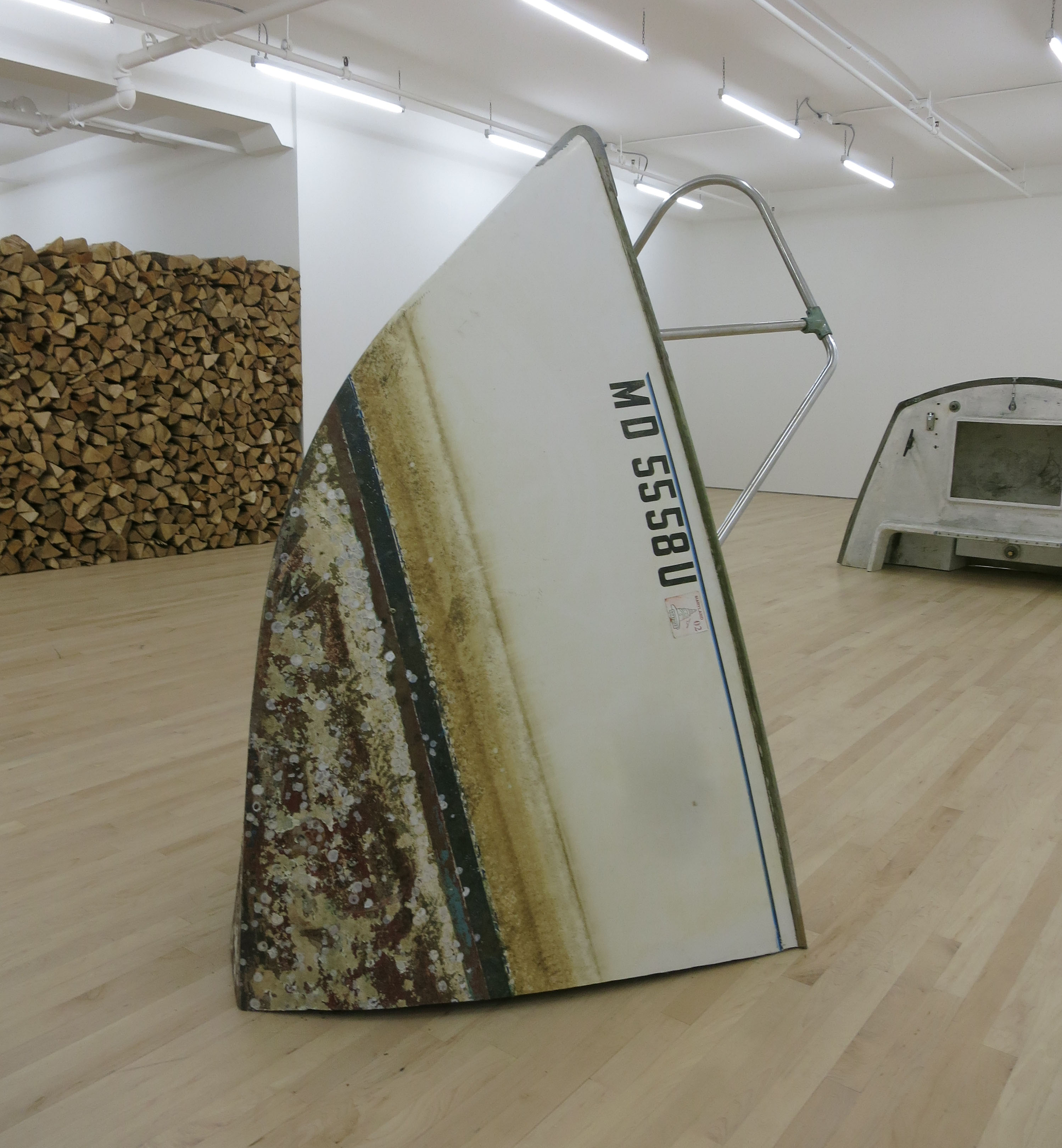 Charles Harlan’s artwork happens at the meeting place of man-made and natural objects, so it comes as no surprise to see him engage repeatedly with boats. For his current show at JTT Gallery on the Lower East Side, Harlan disassembled a boat belonging to a late family member of JTT Gallery owner Jasmine Tsou, turning it into two objects that evidence the effects of time and nature on a once-cherished object. (On view through June 17th).