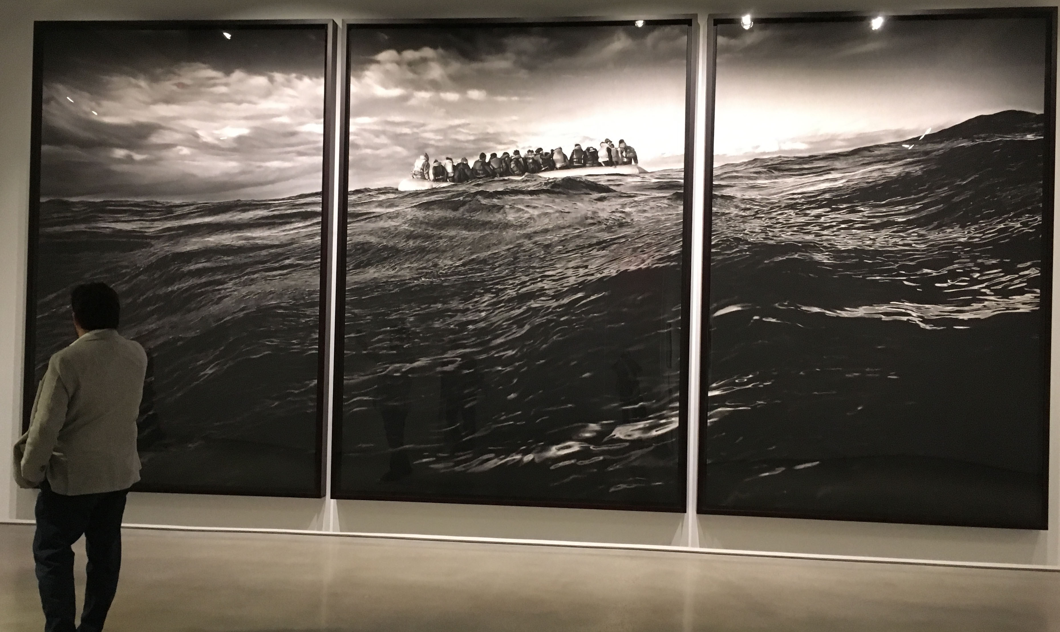 Robert Longo, Untitled (Raft at Sea), triptych; charcoal on mounted paper, 140 x 281 inches overall, 2016-2017.