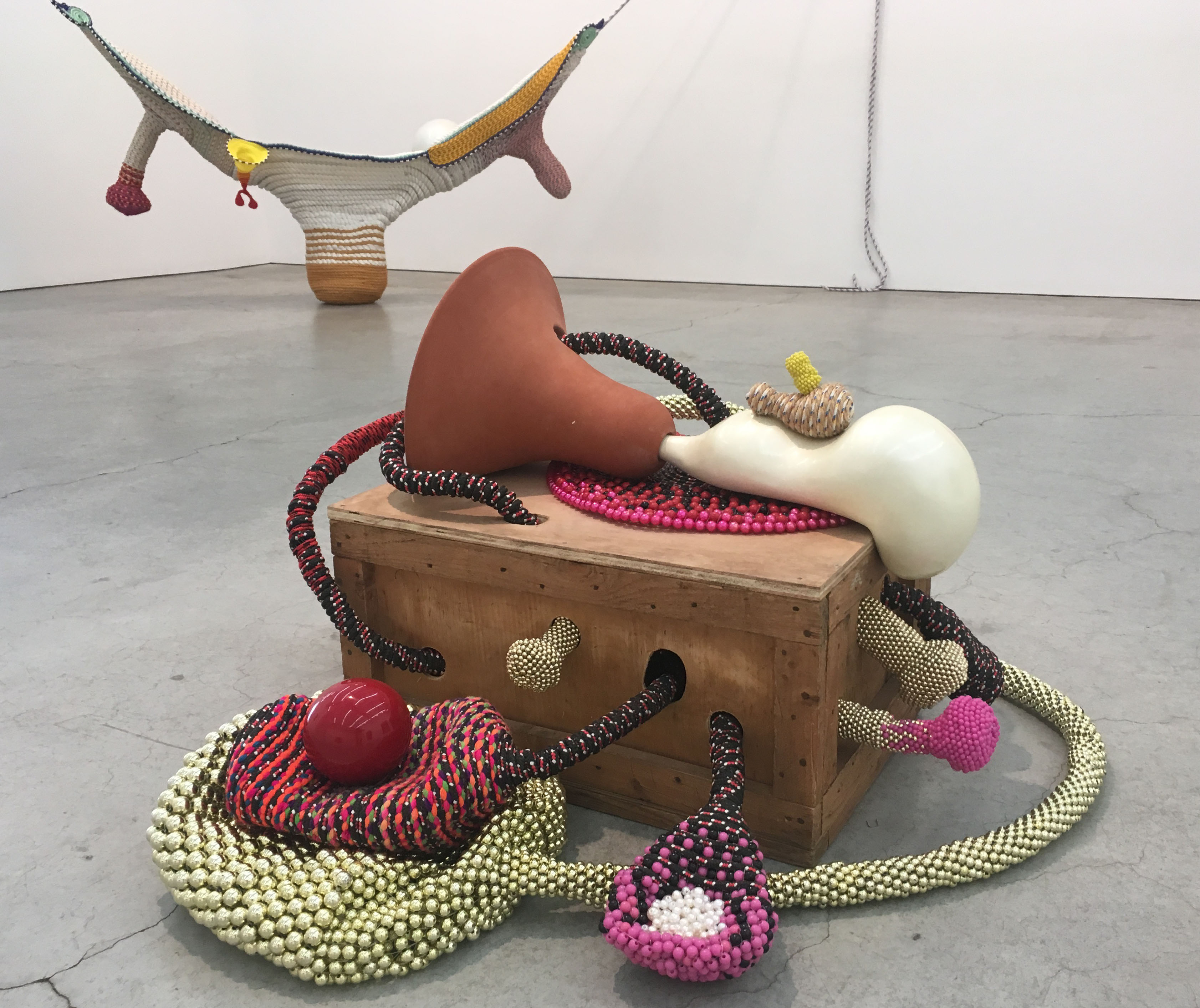 Maria Nepomuceno, Untitled, ropes, beads, ceramic, wood, fiberglass and resin, 27.5 x 29.125 x 24.375 inches, 2015.