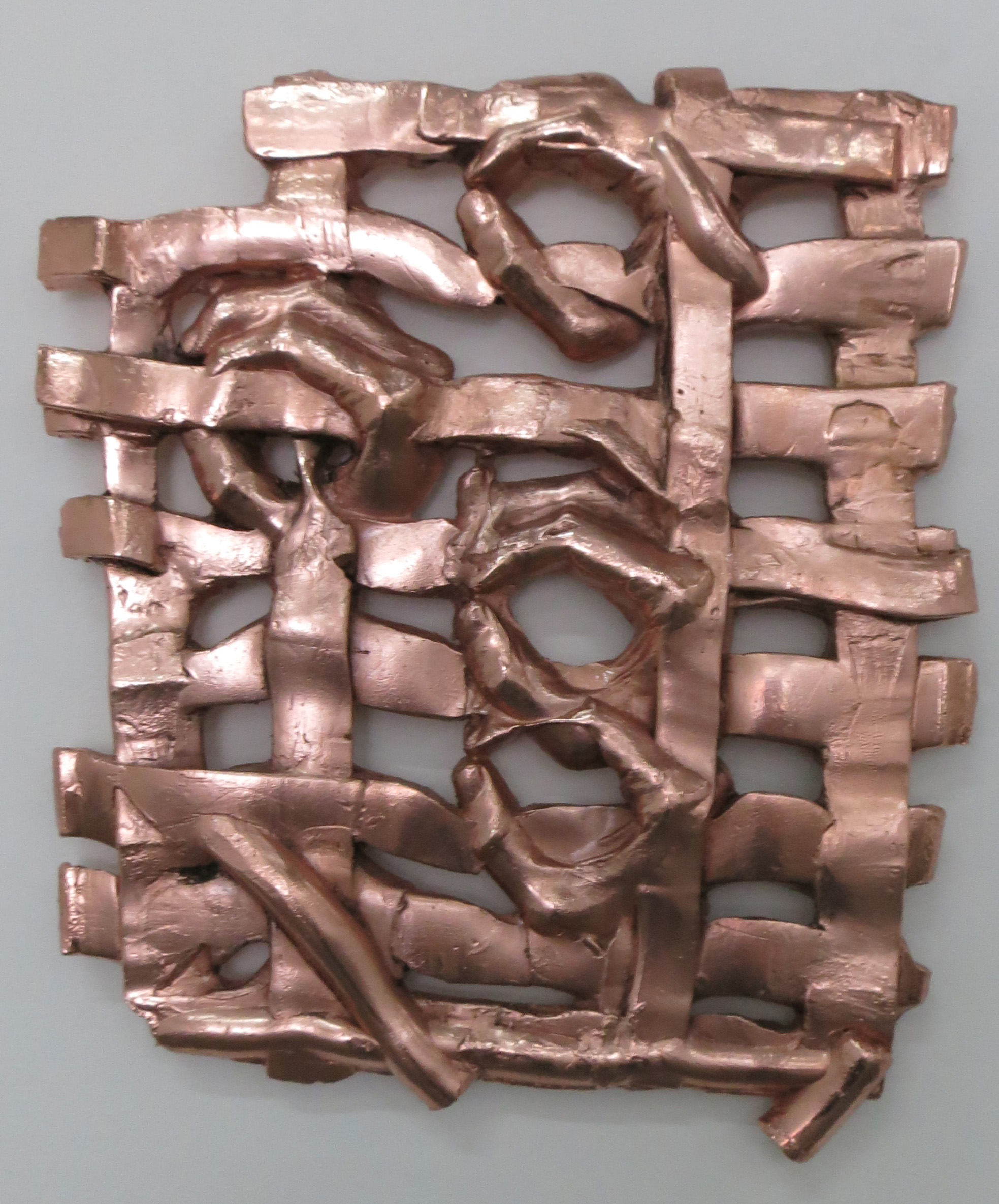 Four hands repeat a gesture with multiple interpretations in the roughly woven lattice of Athansios Argianas’ bright, electroformed copper wall sculpture at On Stellar Rays. Interpretable as OK, perfection (if kissed by the lips), zero or something ruder, the sign is enhanced by a long title that suggests that seeing is as changeable as the sea. (On view on the Lower East Side through June 25th).