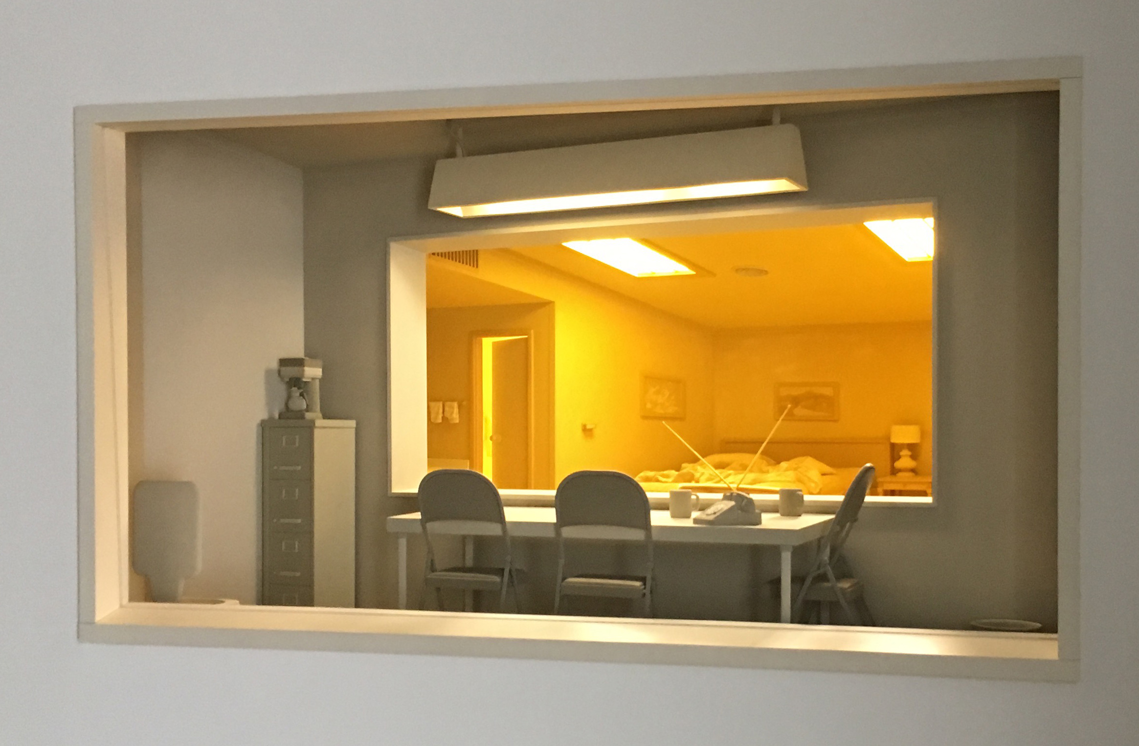 Roxy Paine’s three new dioramas at Paul Kasmin Gallery continue the artist’s interest in systems of control. Here, a view into a view into a hotel room alludes to the CIA’s experiments in administering LSD to unsuspecting civilians in the 1950s. The meticulously crafted scene illustrates a shocking invasion of privacy and personal well-being. (On view in Chelsea through July 1st).