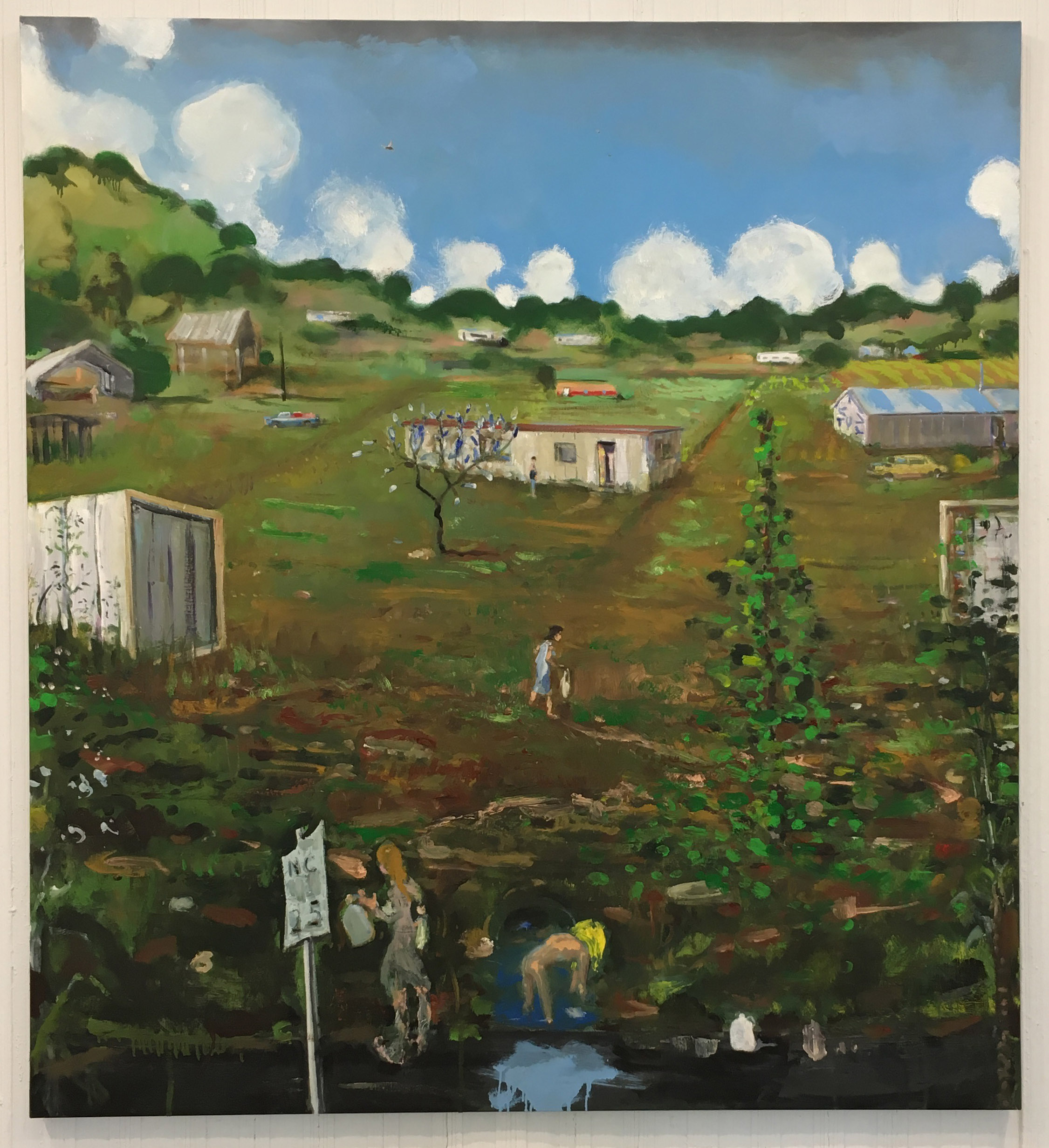New paintings made in New York and North Carolina feature spring blossoms and mobile homes in Verne Dawson’s current show at Gavin Brown’s Enterprise. In the foreground of this bucolic but blighted landscape, Dawson portrays a pastoral scene of women bathing and gathering water, not from a sylvan spring but from a ditch. (At Gavin Brown’s Enterprise on the Lower East Side through June 24th).