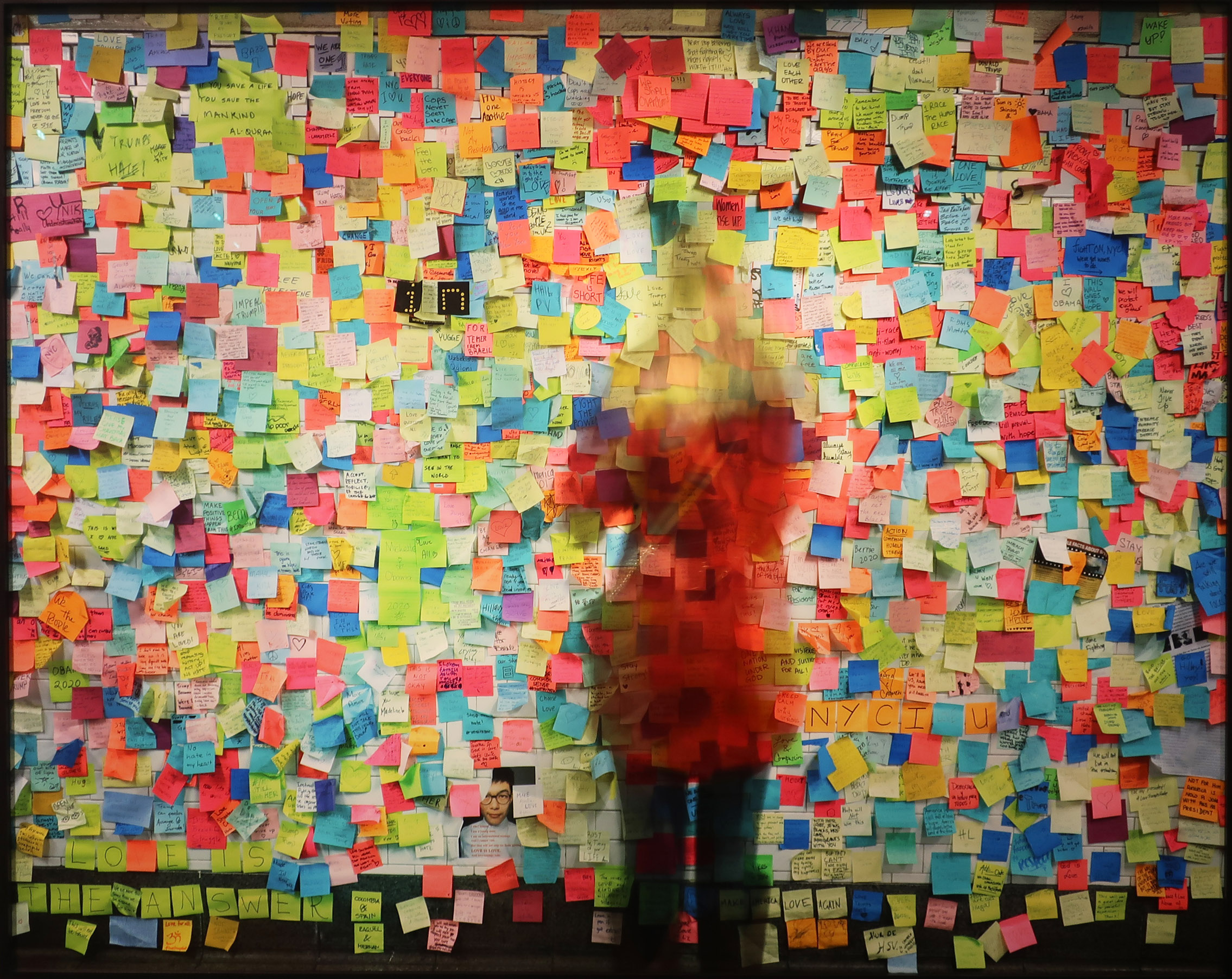 Using his signature long exposure technique, Matthew Pillsbury turns his lens for his latest show, ‘Sanctuary’ at Benrubi Gallery, on basic rights – assembly and expression – that are often taken for granted. Here, a participant pauses in front of Matthew Chavez’s ‘Subway Therapy’ project, which provided pens and post-its for New Yorkers to express their thoughts after the 2016 presidential election. (On view in Chelsea through Nov 22nd).