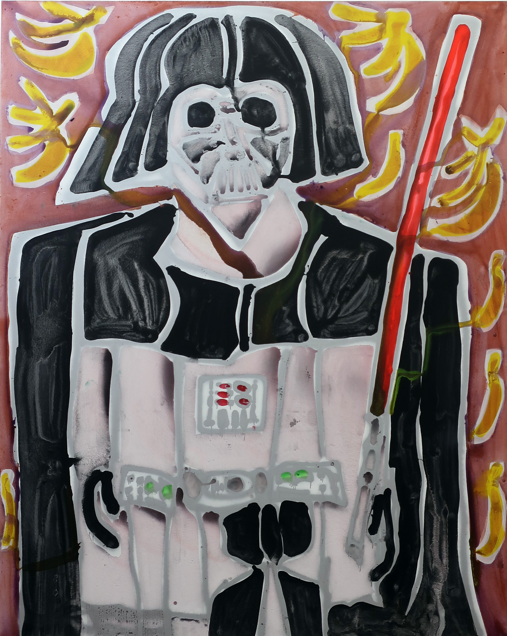 There’s trouble in the tropics in Katherine Bernhardt’s latest solo show of pattern paintings at Canada New York. Watermelons appear alongside toilet paper, birds in flight next to cigarettes as nature contrasts man-made products in paintings with ominous titles like ‘Climate Change.’ Here, in ‘Dole + Darth Vader,’ the Sith lord is surrounded by Dole bananas, linking a fictional face of evil to a company criticized for damaging the environment and harming workers. (On view on the Lower East Side through Feb 11th).