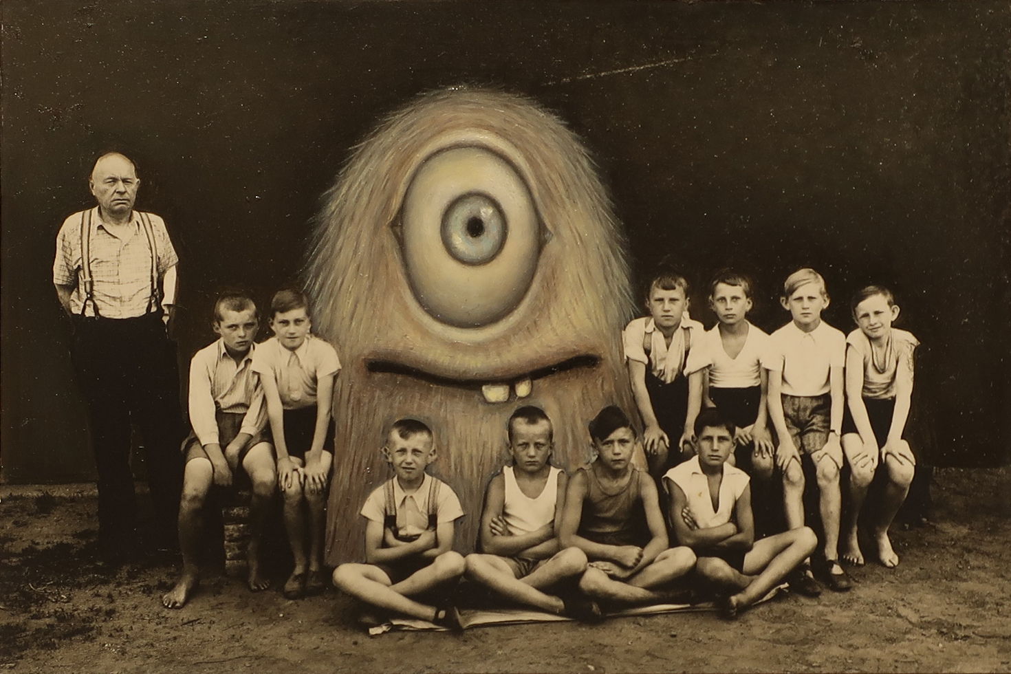 Jana Paleckova, untitled (man, boys and furry cyclops,) oil paint on vintage photograph, 7h x 9w inches, 2017.