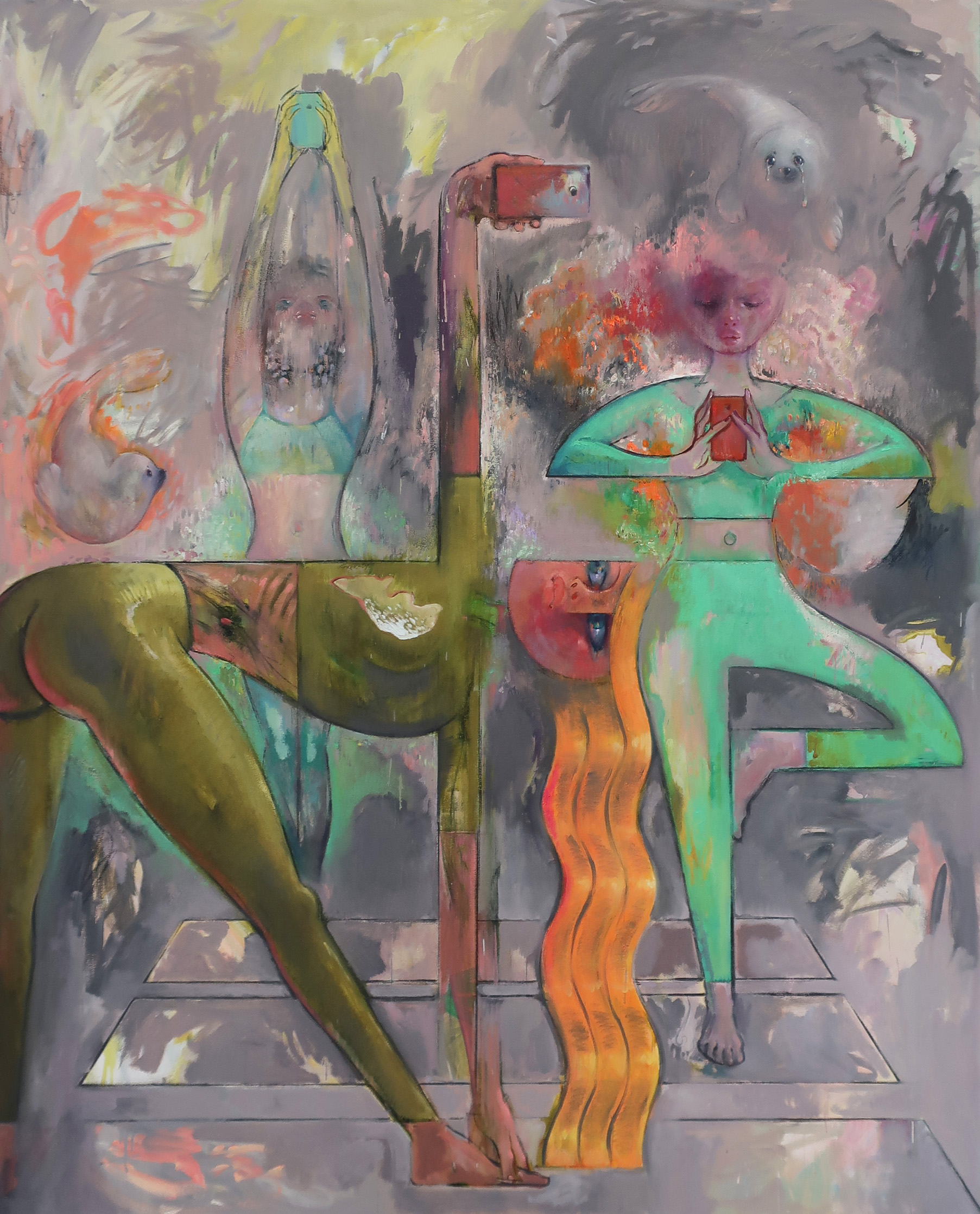 Nodding to the title of Picasso’s carefully posed 1907 bevy of red-light district workers, ‘Demoiselle D’Avignon,’ Delia Brown’s exhibition ‘Demoiselle d’Instagram’ is a hilarious, tongue-in-cheek take on today’s social media self-styling. Departing radically from her signature realist style, Brown surrounds her subjects in shimmering halos of energy, perhaps emitted from the phones that absorb the attention of each woman. Meanwhile, baby seals float through the air – their plight ignored by self-absorbed humans. (On view at Tibor de Nagy on the Lower East Side through June 17th).