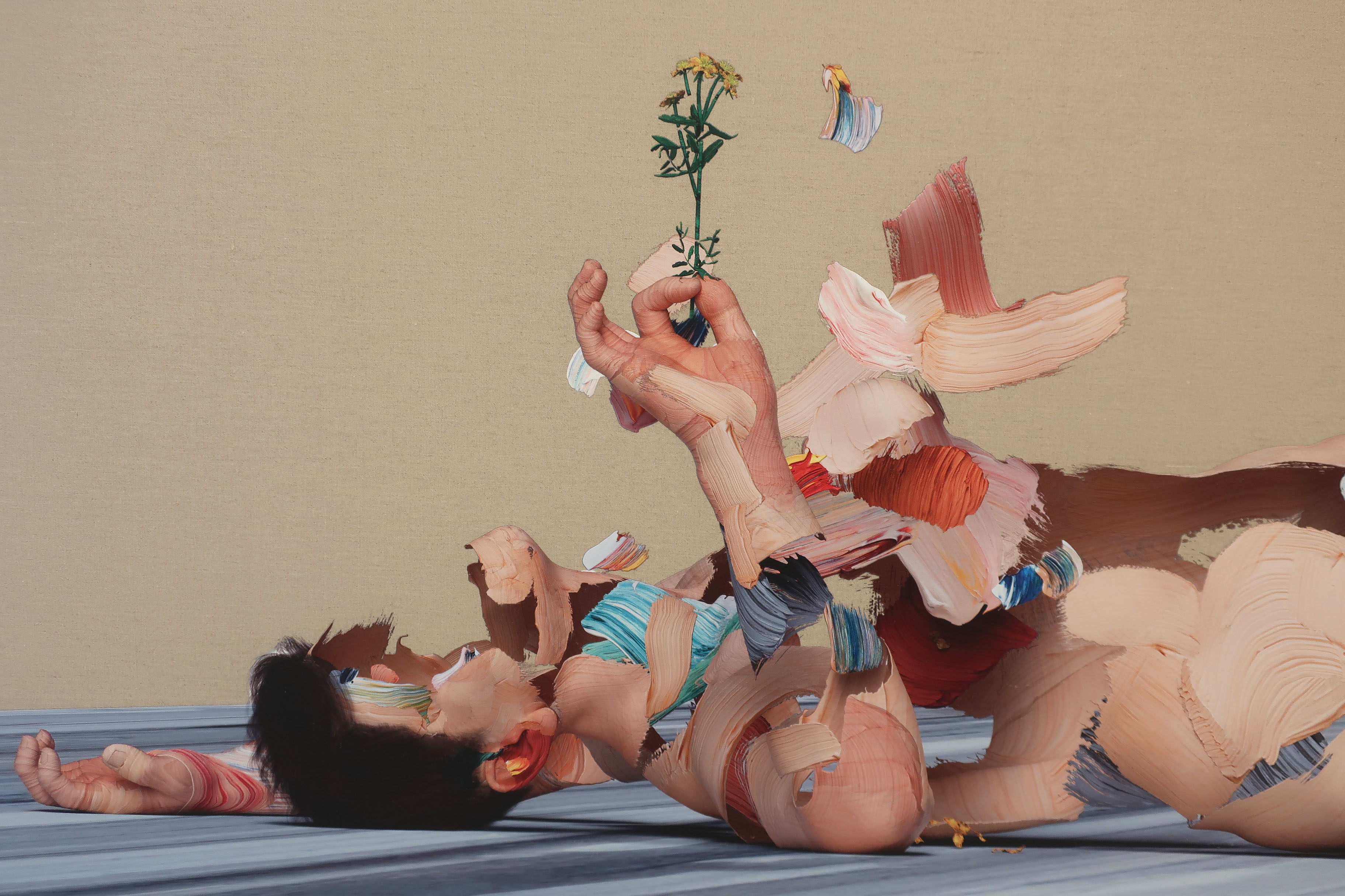 British artist Matthew Stone’s stunning merger of virtual and real (as played out on canvas) was a standout in The Hole NYC’s past ‘Post Analogue Painting’ shows, in which artists demonstrated how digital tools have altered the way they conceive of painting’s possibilities. In his latest work, Stone introduces a maelstrom of bodies, half-formed by a vocabulary of brushstrokes that he first paints on glass, photographs, then digitally models into not-quite-classic nudes. (On view on the Lower East Side through June 24th).
