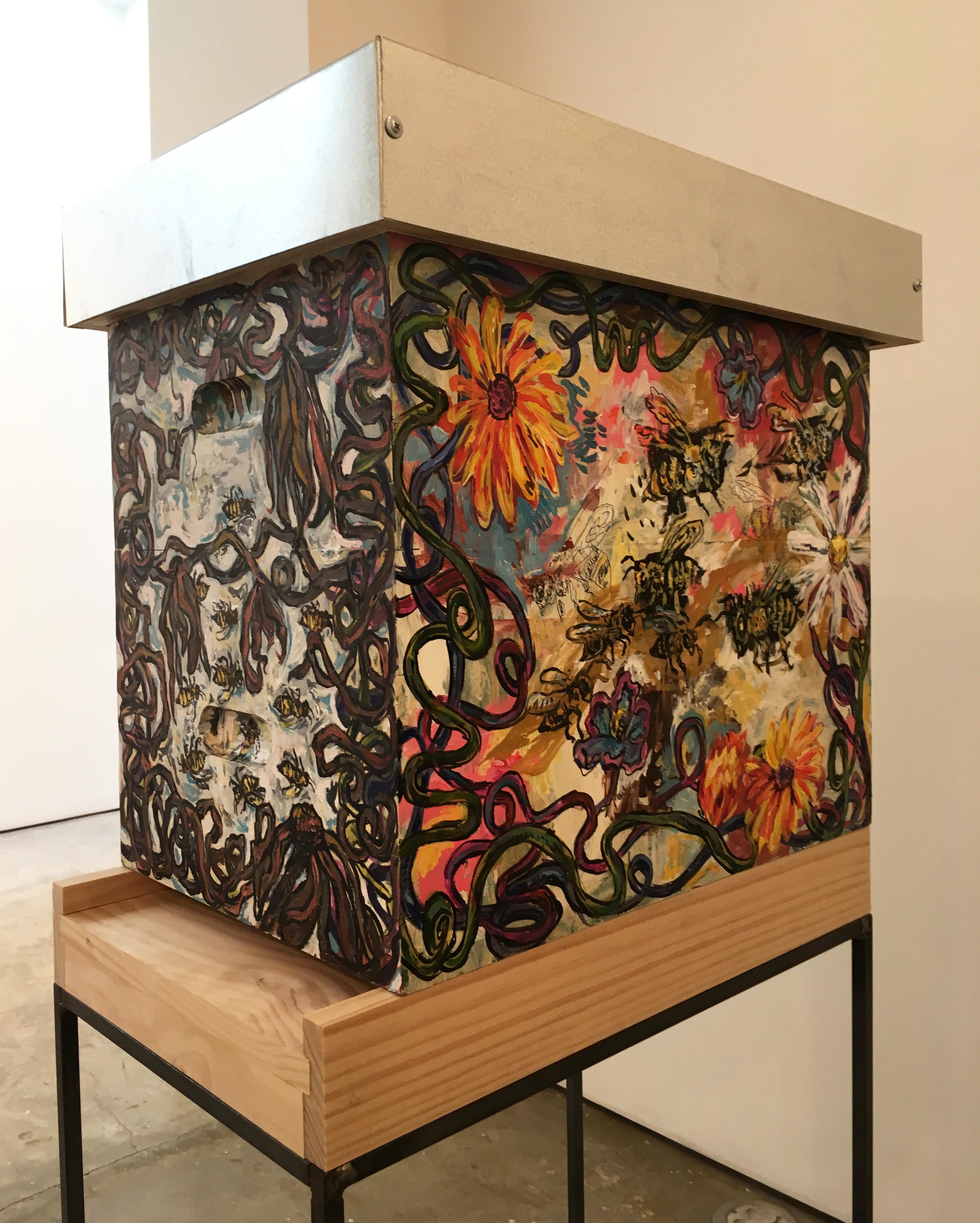 Brooklyn-based artist Joseph Zito’s forays into beekeeping inspired his recent series of hives, created in tandem with artist friends and currently on display at Lennon Weinberg Gallery in Chelsea. Here, painter Gary Mayer’s energetically painted box issues a warning, portraying a cluster of frenetic bees in a paradise of flowers on one side and dead bees experiencing colony collapse on the other. (On view through August 17th).