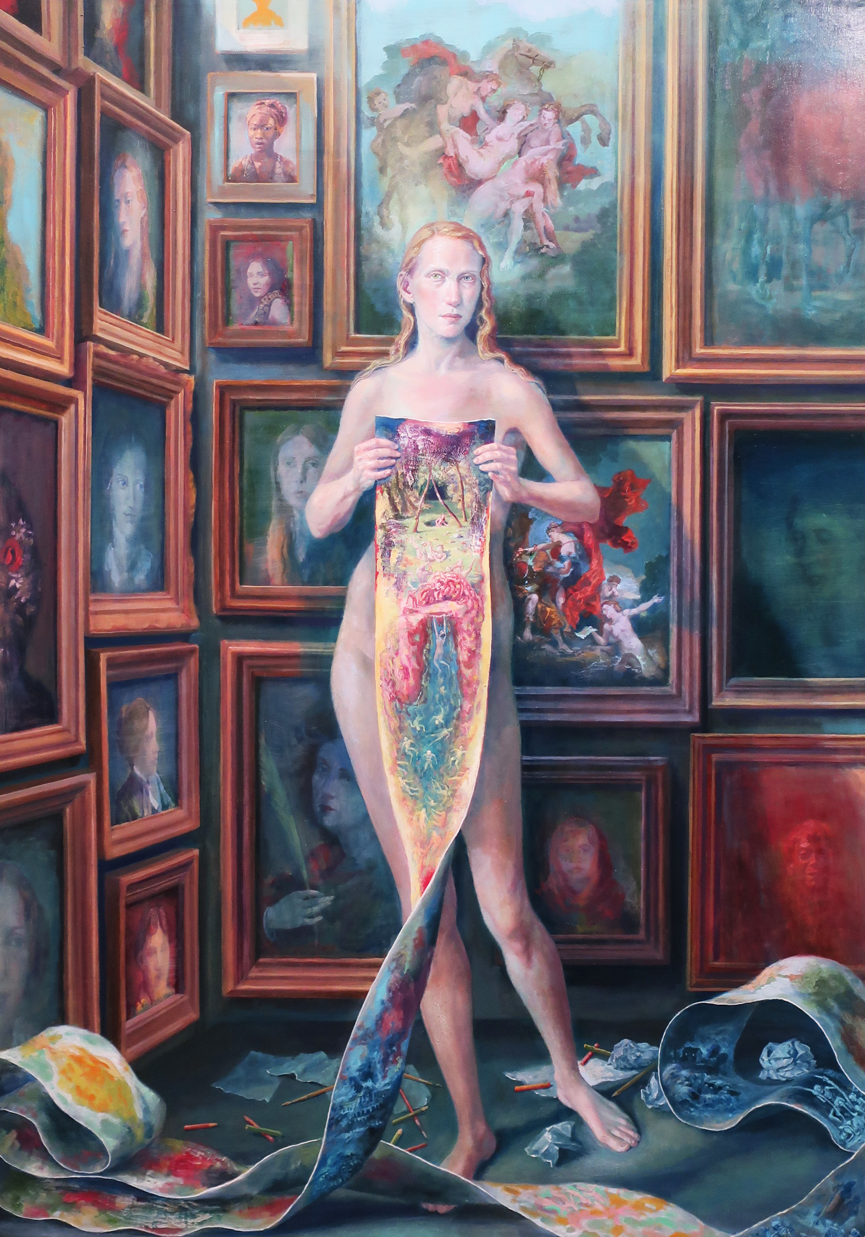 Julie Heffernan, Self-Portrait with the Daughters, oil on canvas, 79 x 56 inches, 2018.