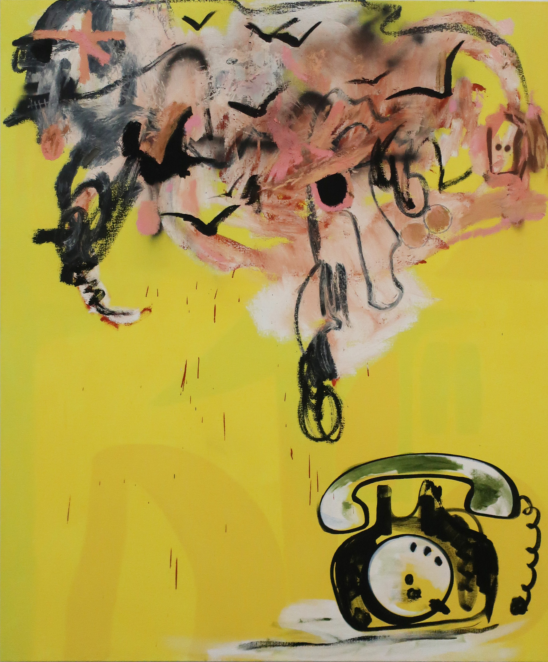 An ominous cloud of fleshy tones and dark lines conjures hidden images (birds? an angular face?) as it hovers over an old-fashioned telephone in Charline von Heyl’s ‘Dial M for Painting.’ Like Hitchcock’s ‘Dial M for Murder,’ intrigue and tension dominate; a hastily drawn telephone leads us in to the drama while the floating mass above gives pause for thought, all against a screaming yellow background. (On view at Petzel Gallery in Chelsea through Oct 20th).