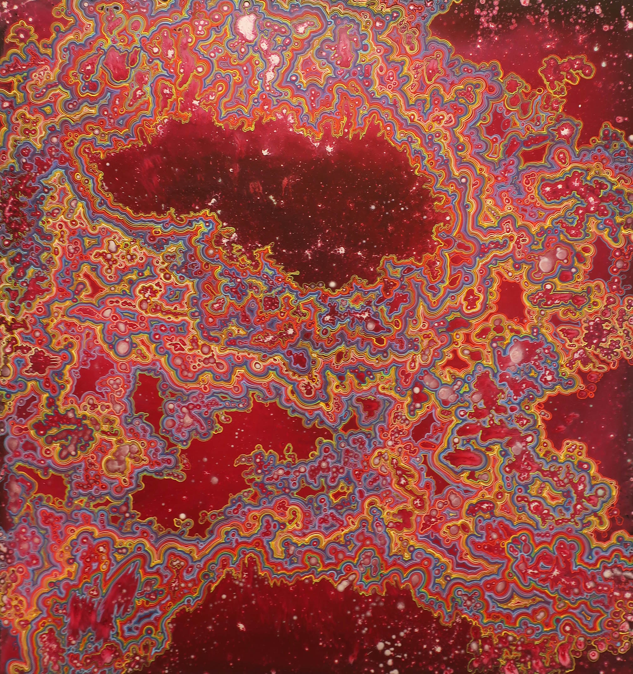 Barbara Takenaga’s abstract paintings evoke natural phenomena – here, a polished cross section of a stone or a distant view of far galaxies. In the case of ‘Overview,’ a standout in her latest solo show at Chelsea gallery DC Moore, she electrifies the heavens with vibrant color and gratifying complexity. (On view through Oct 6th).