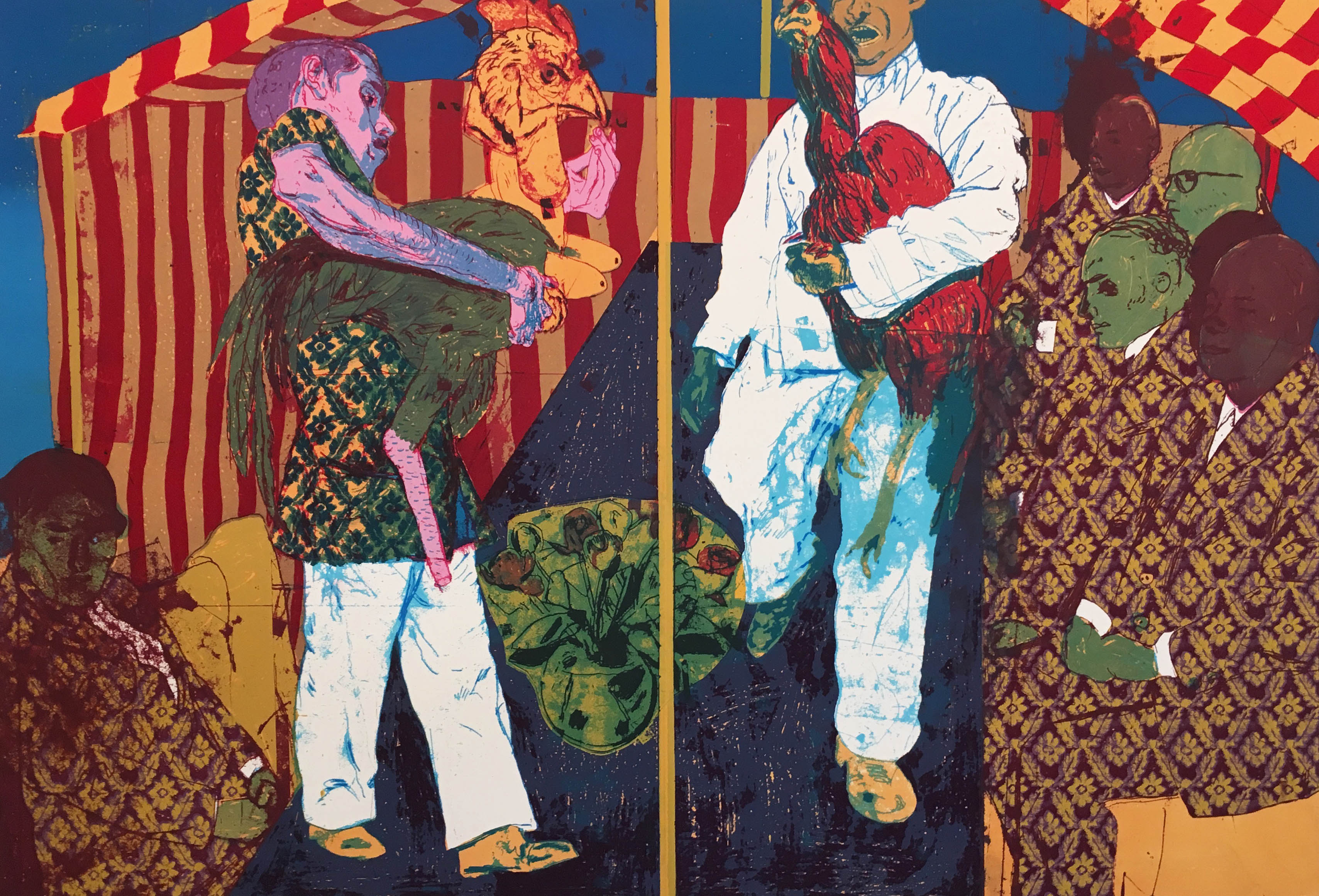 Male behaviors and rituals occupy Ohio-based printmaker and current International Print Center New York resident artist Morteza Khakshoor’s colorful, dream-like prints. This piece, ‘Men of High Culture’ is a standout in the IPCNY’s current juried exhibition of new prints. Including a homogeneously dressed cast of male wall flowers and two figures grappling with eccentric creatures and separated by a vase of flowers, Khakshoor’s setup reinterprets the uber-male cockfight. (On view through Sept 22nd).