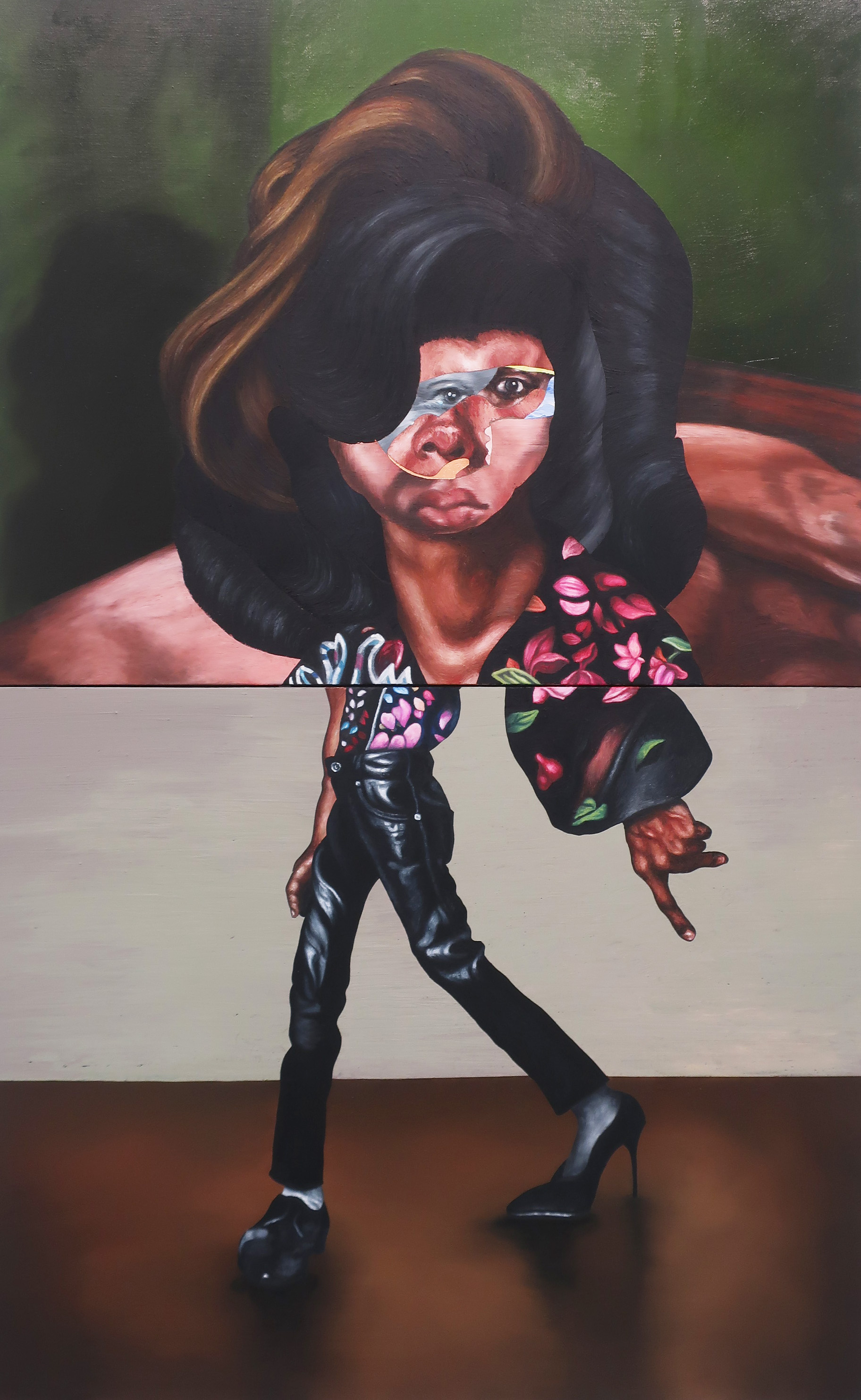 Nathaniel Mary Quinn, America’s Next Top Model, oil paint, paint stick, oil pastel, gouache on linen canvas, 80 x 50 inches, 2018.
