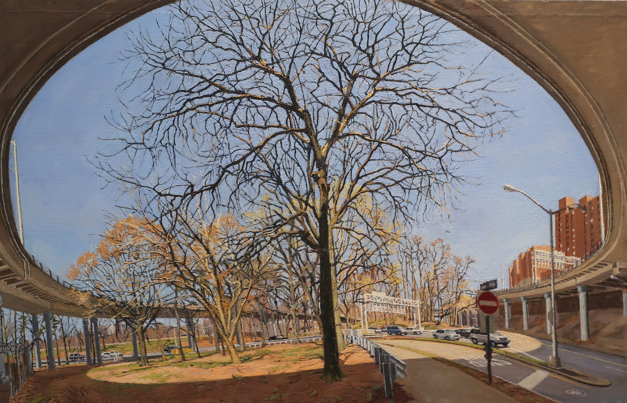 Rackstraw Downes, Under a U-Turn on the Ramp from the George Washington Bridge to the Rte. 9A North, oil on canvas, 23 ½ x 37 inches, 2013.