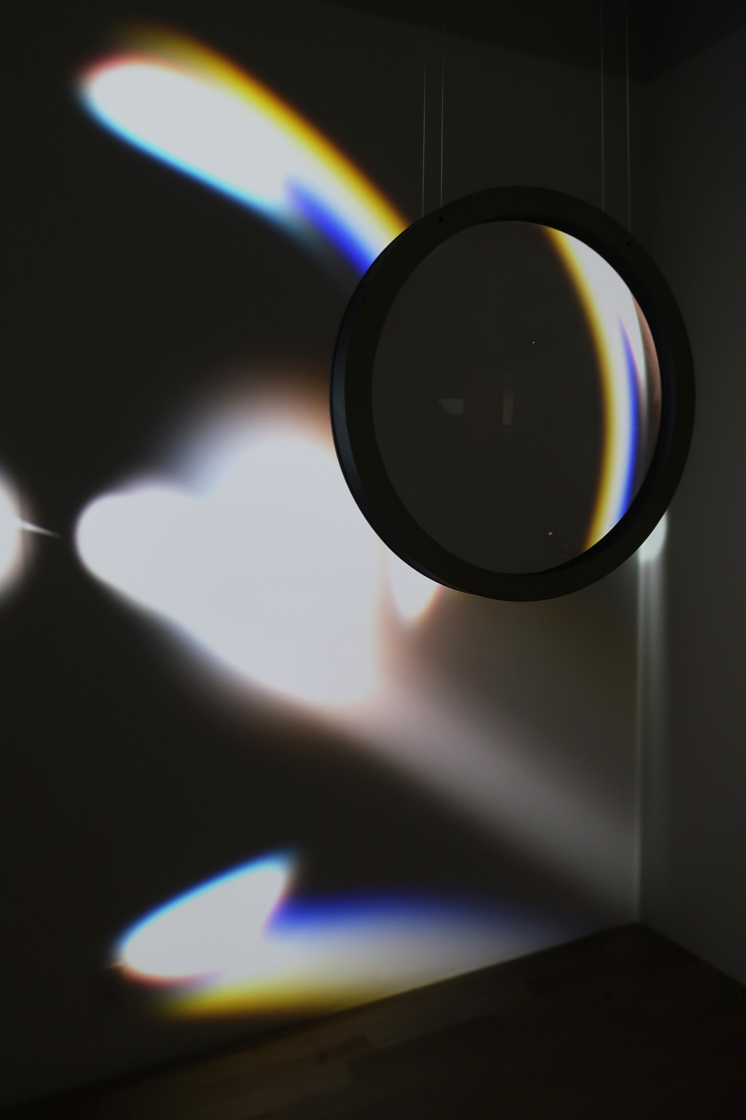 A plano-convex lens dangling under three projectors creates a mesmerizing, constantly shifting pattern of light on the walls in Rafael Lozano-Hemmer’s latest solo show at Bitforms. In advance of a major exhibition of his interactive environments at the Hirshhorn this fall, the artist’s current exhibition tantalizes with small scale pieces from the past few years that evoke wonder at the intersection of technology and the natural world. (On view on the Lower East Side through Oct 21st).