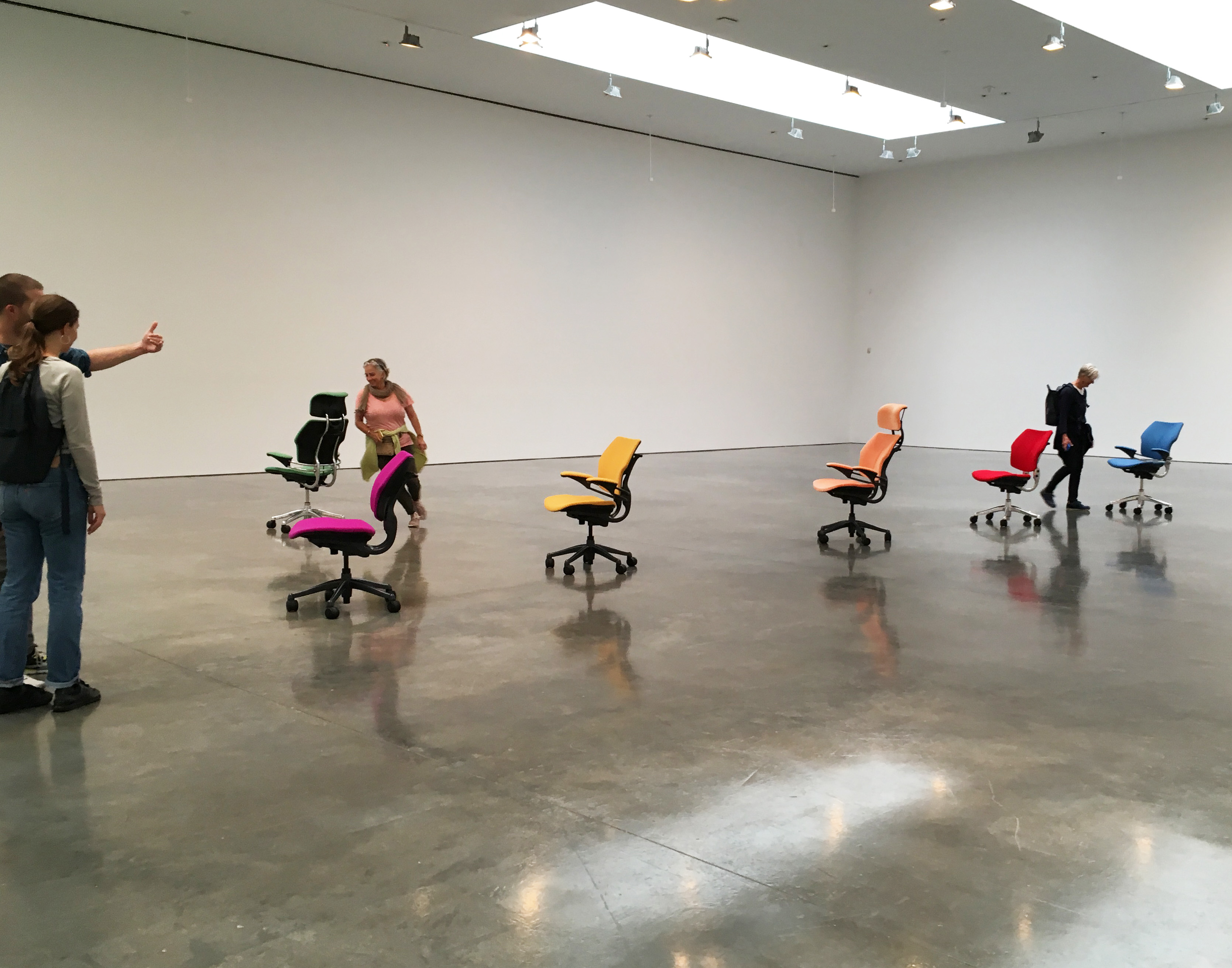 Urs Fischer wants art to ‘do more than it does.’ With a team of software engineers and the input of choreographer Madeline Hollander, the New York-based Swiss artist sets out to surprise gallery visitors with a troupe of dancing office chairs, programmed to interact with each other and humans. Dubbed ‘robotic sculptures,’ the chairs come across as sinister if they come up behind you but strangely cute from the front as they hover nearby, slowly swiveling their wheels like a dog wagging its tail. Here, several engage in a group animation reminiscent of a chorus-line about to kick up its heels. (On view at Gagosian Gallery through Oct 13th).