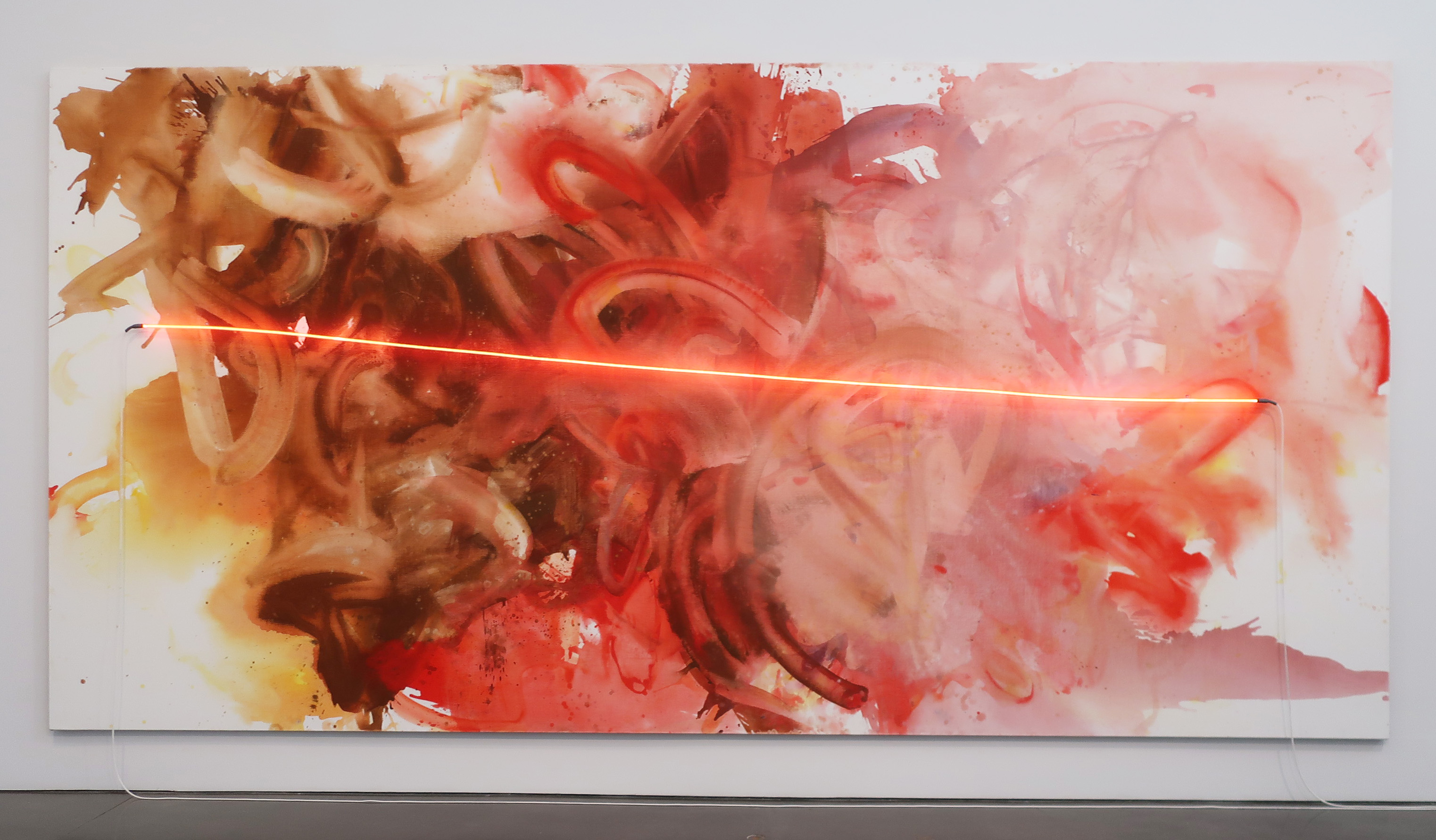 Mary Weatherford, GLORIA, flashe and neon on linen, 117 x 234 inches, 2018.