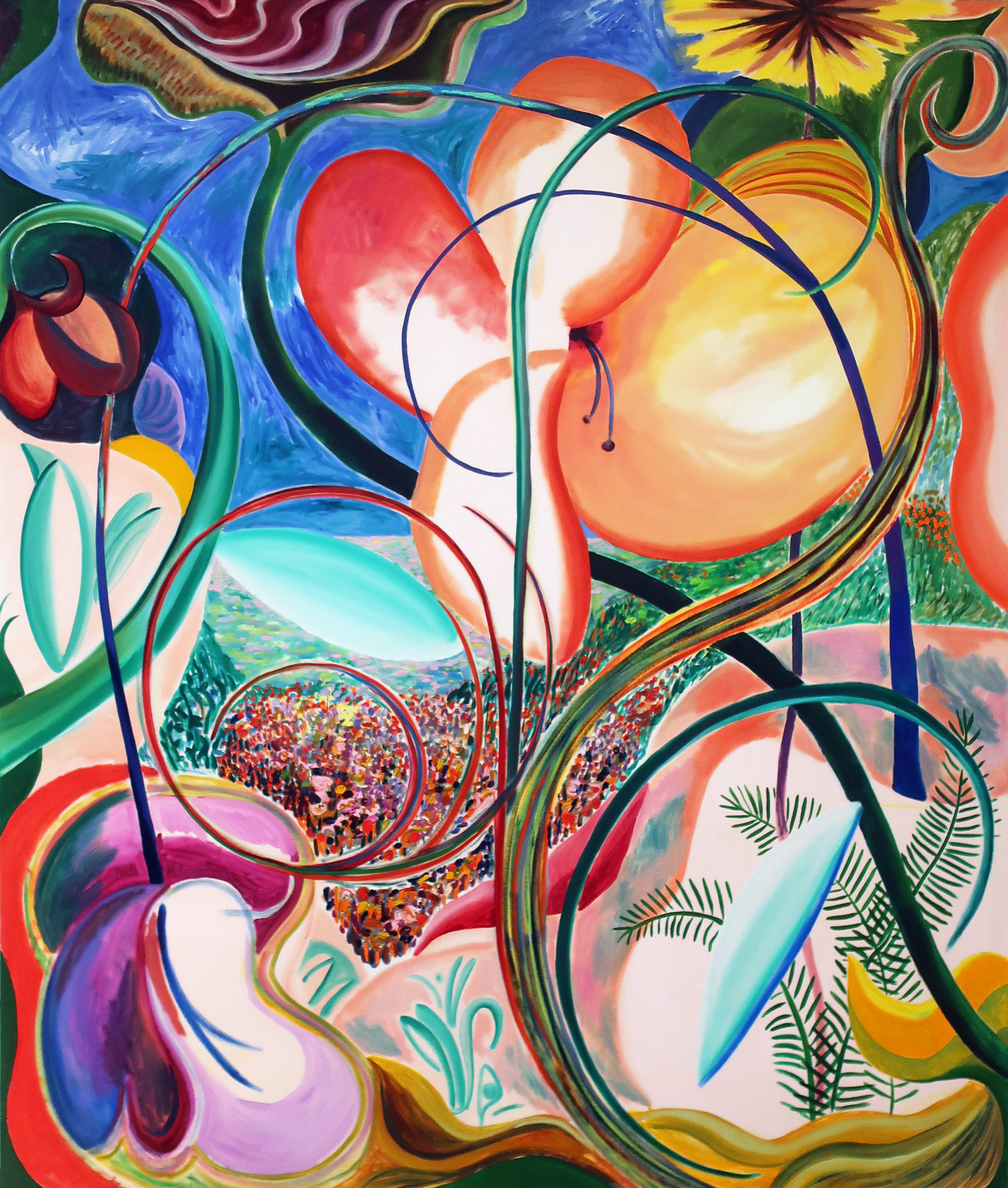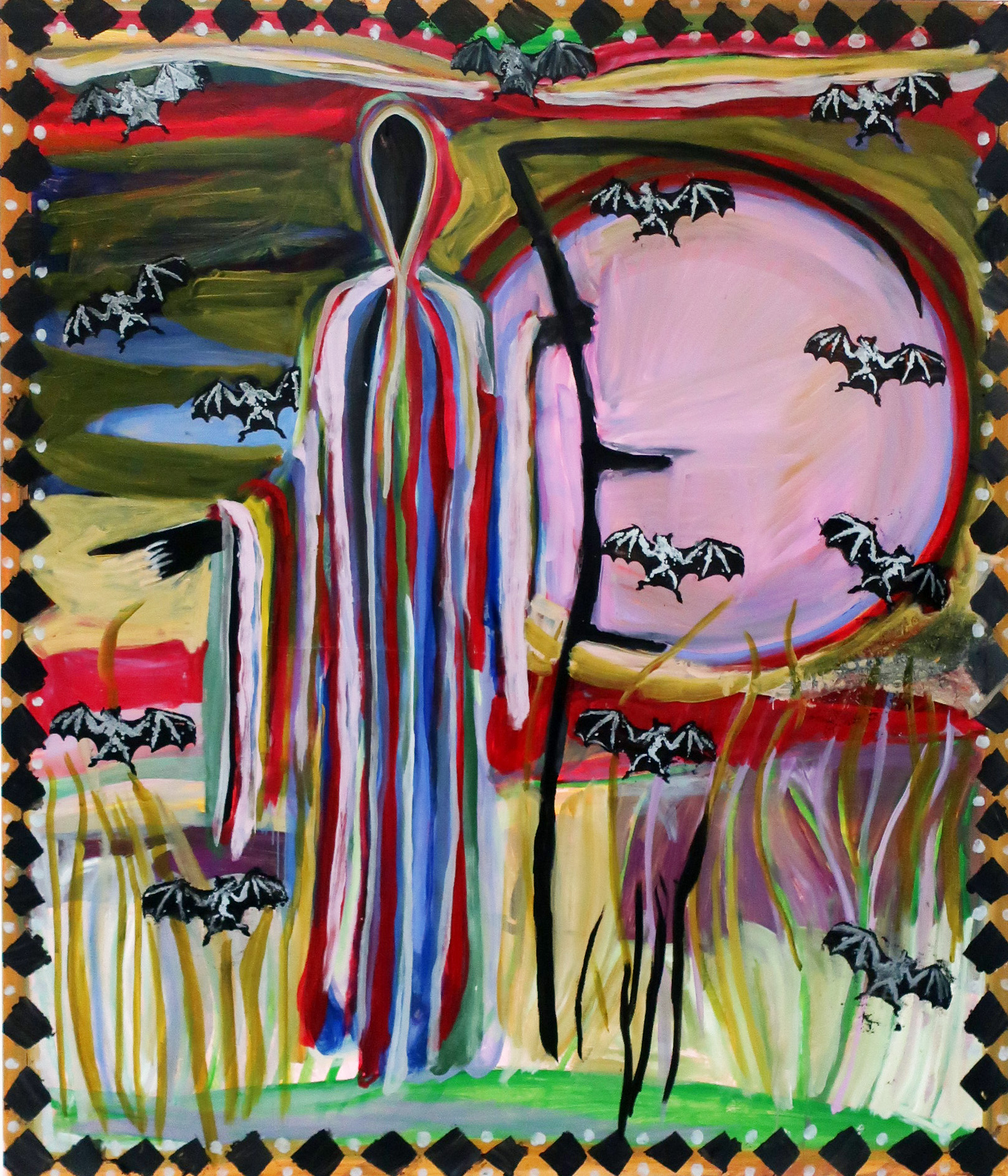 ‘Holiday,’ Josh Smith’s painting of the Grim Reaper, may represent a vacation in Edvard Munch’s world, but otherwise has more to do with livening up a typically drab comic convention. A super-abundance of cute bats, Death’s multi-colored robe and a huge moon that’s more pretty-in-pink than bloody liven up a scene that should be darker than it is. While this representation might not exactly make death look good, the makeover is worth thinking about. (On view at David Zwirner Gallery in Chelsea through July 19th).