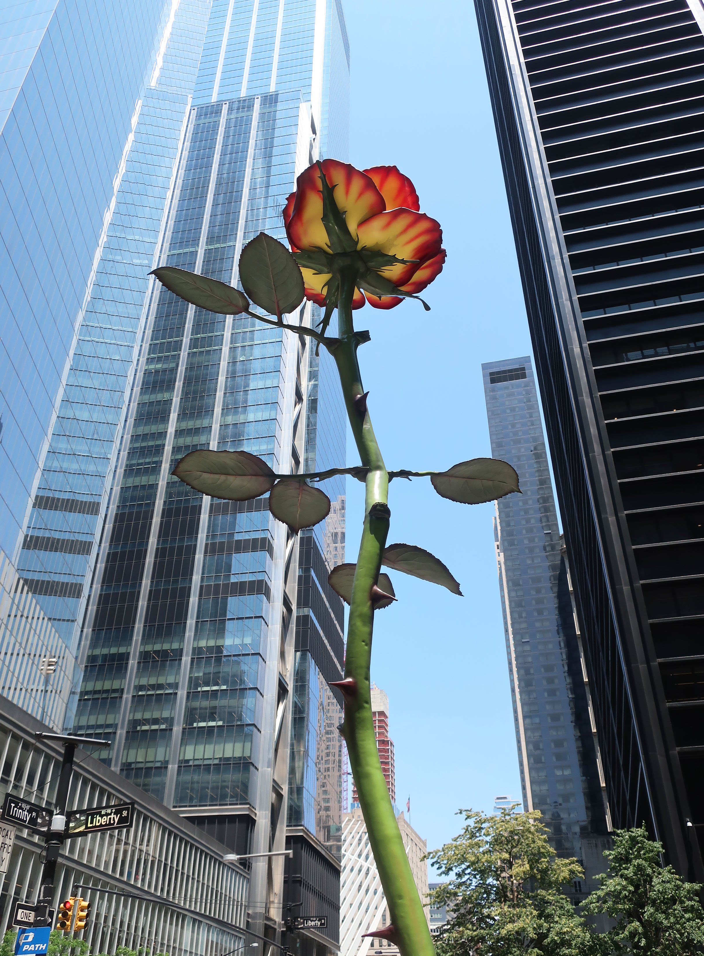 Berlin-based sculptor Isa Genzken loves New York. Years ago, she visited the city as a teen and has returned regularly, expanding her interest in the interrelation between buildings and other aspects of the urban fabric. Versions of her 26-foot-tall rose, a token of love, debuted on the façade of the New Museum and dominates MoMA’s currently closed sculpture garden. This iteration, installed permanently on the corner of Zuccotti Park and Trinity Place, winkingly adds ornament to the stripped-down modernist buildings in the area while continuing to express affection for the city on still-quiet downtown streets.